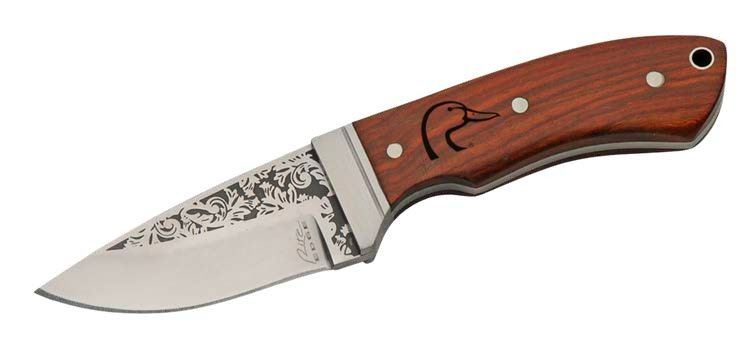 7.5" Fixed blade knife. Rosewood and ebony handle. DU logo is etched on the blade. Includes nylon sheath with patch logo