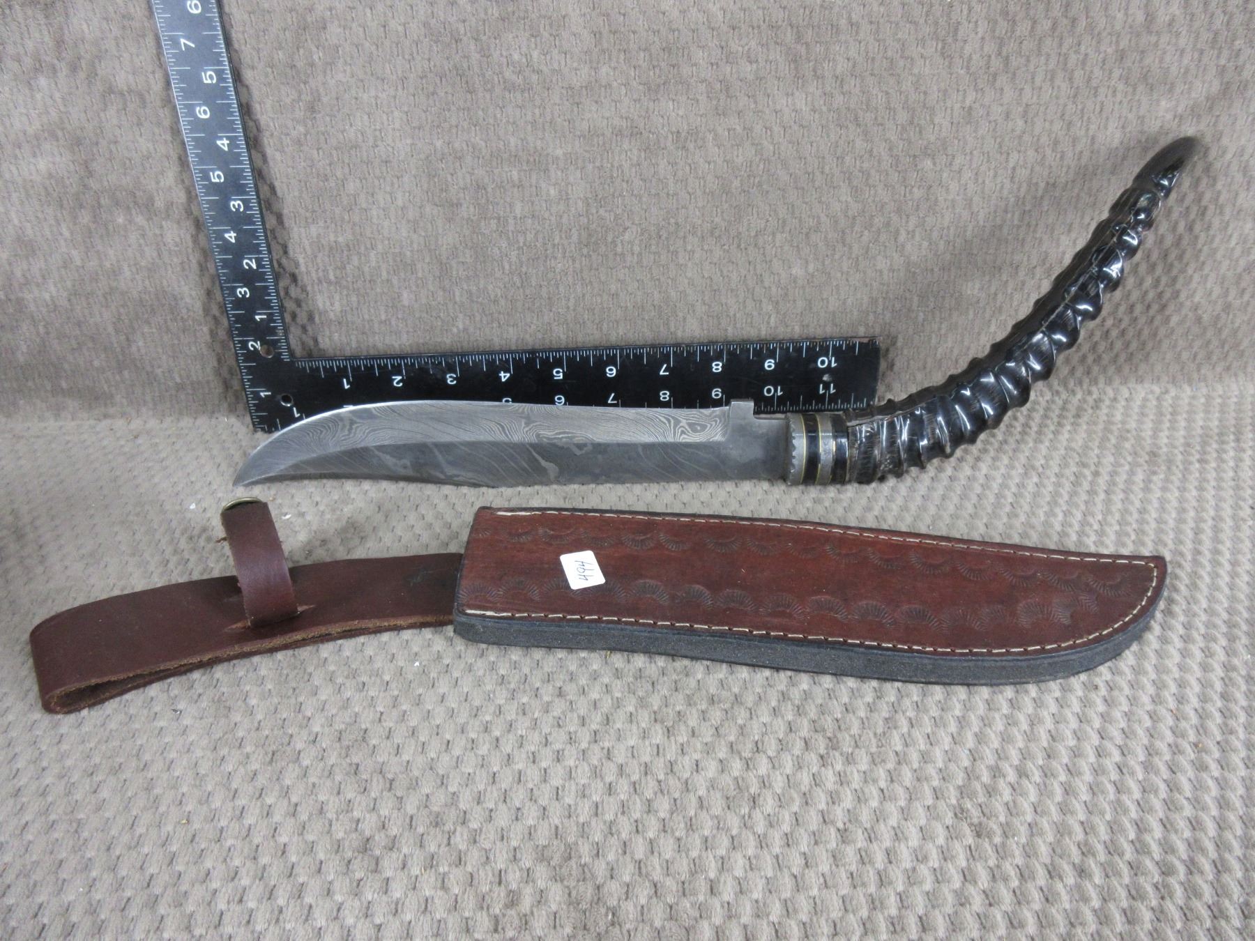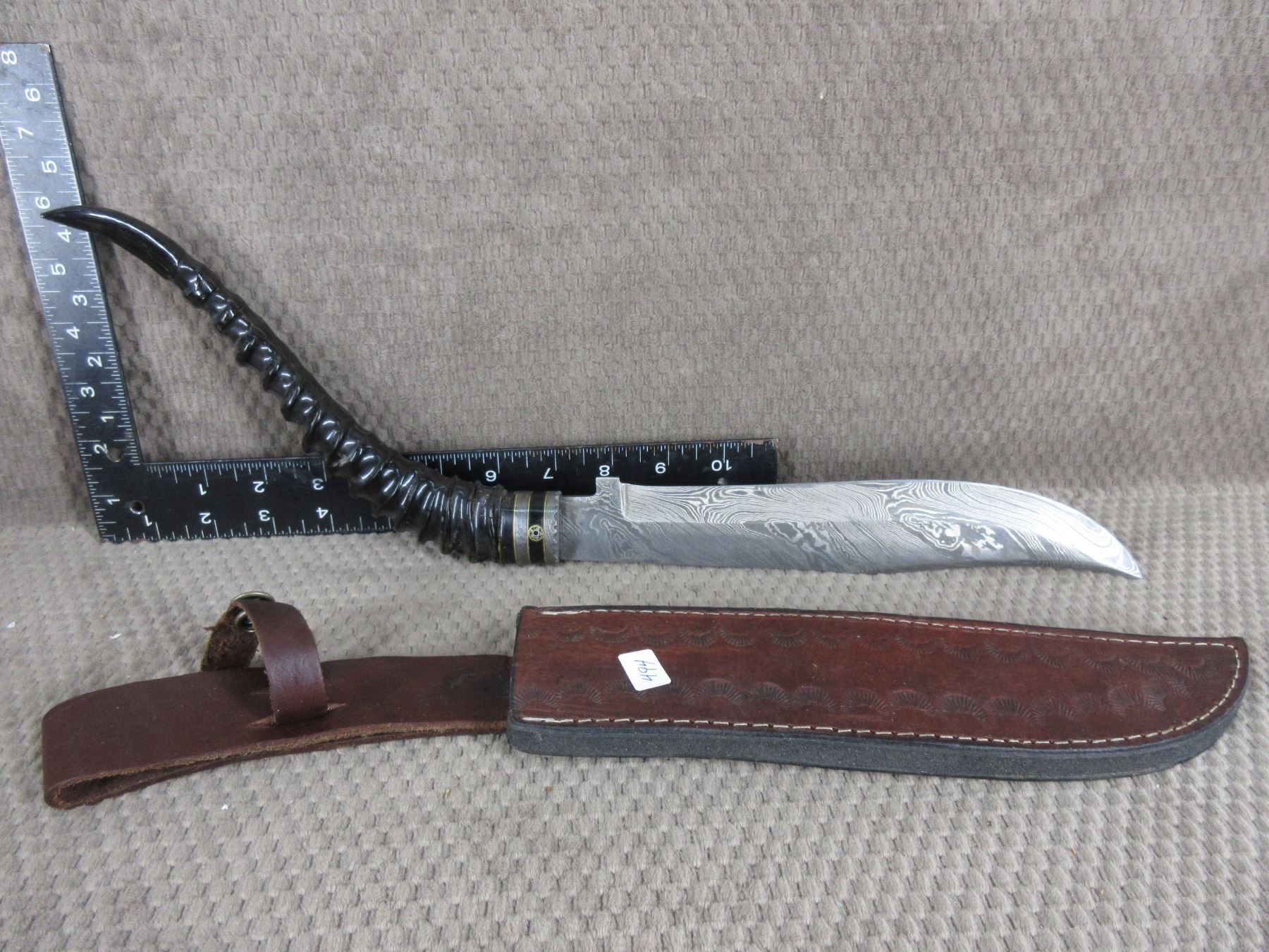 Fixed Blade Damacus Knife with Horn Handle & Sheath - Appears unsed but horn has drying crack