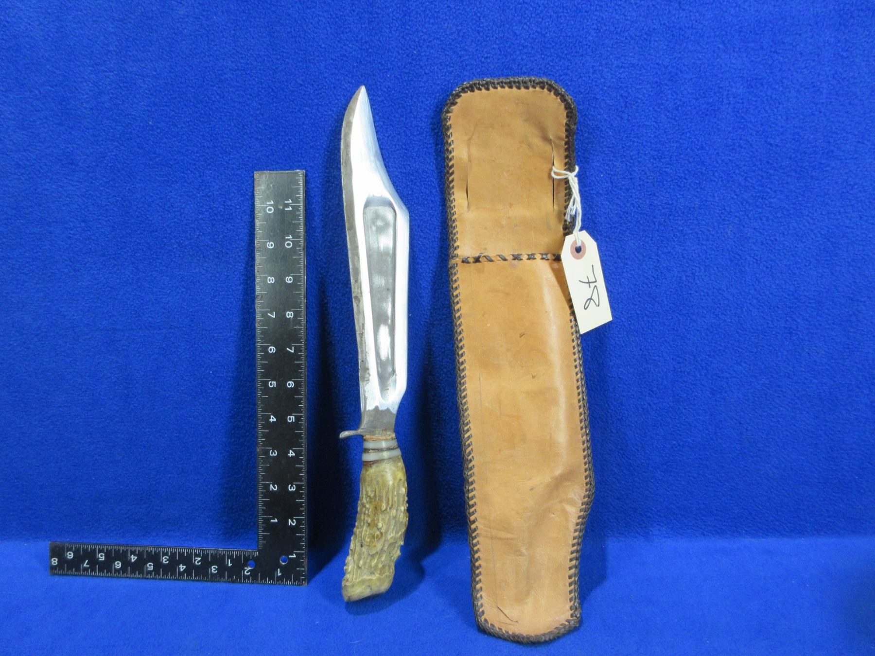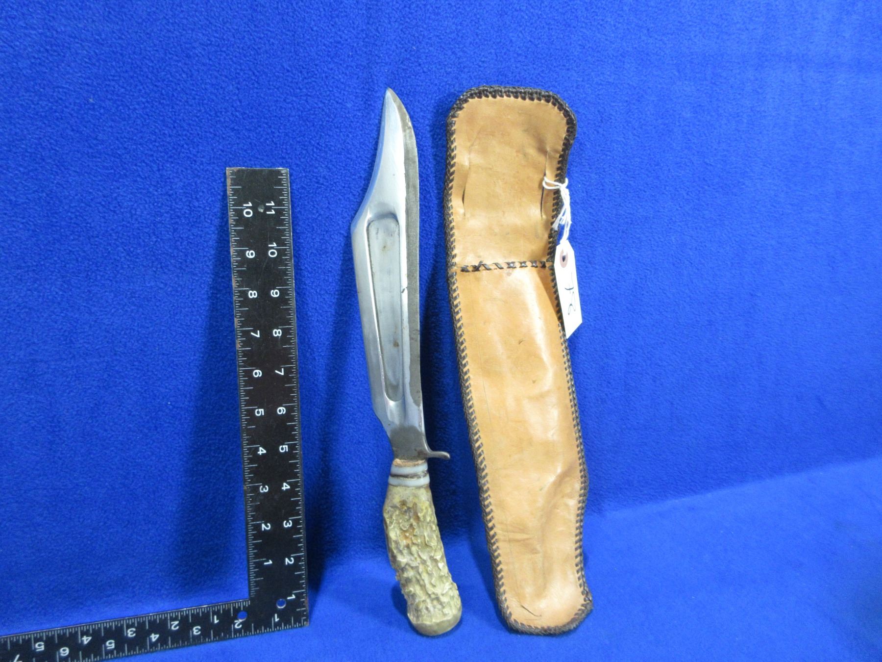 Fixed Blade Knife with Stag Handle and Leather Sheath - 9 1/2" Blade