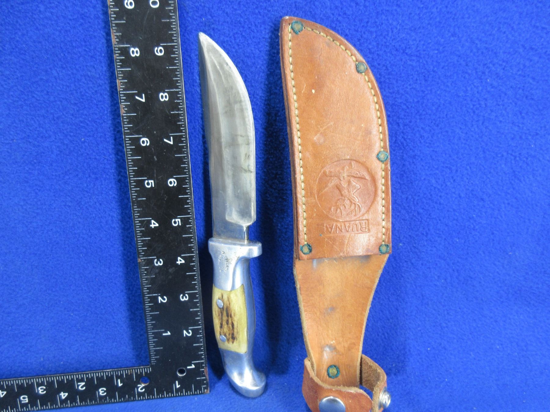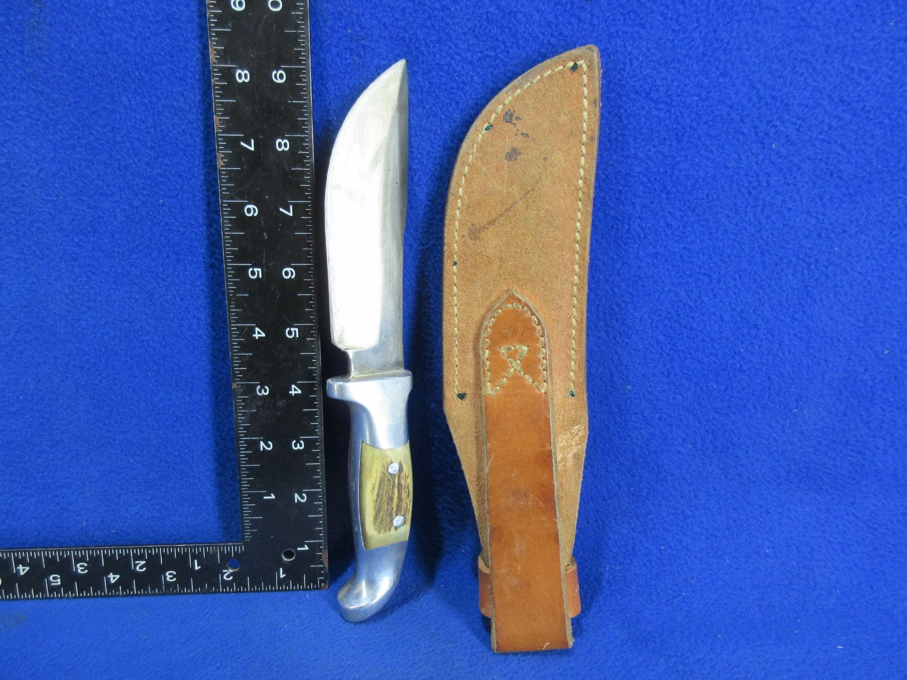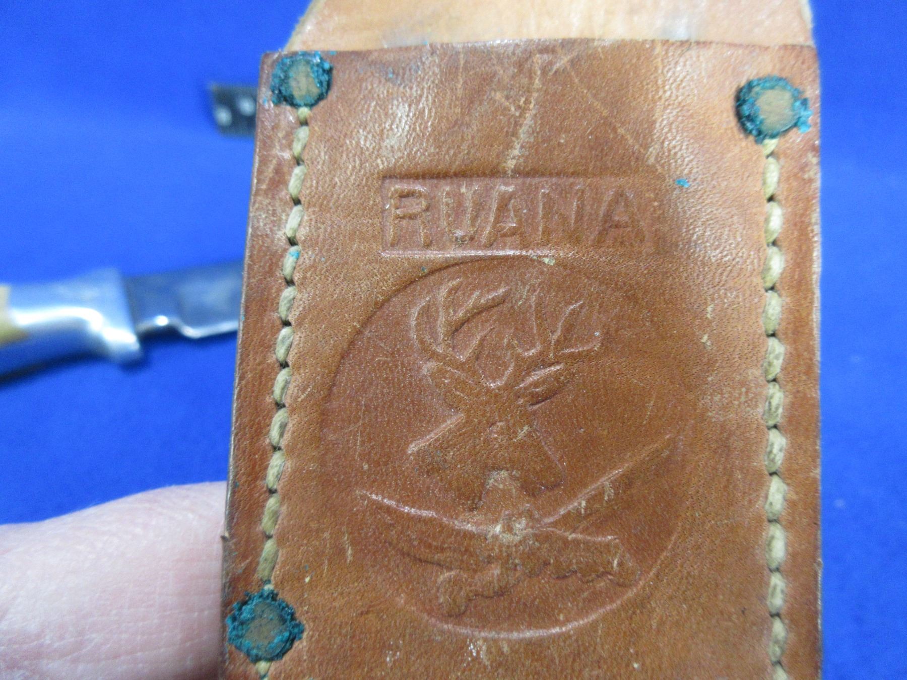 Fixed Blade R.H. Ruana Knife with Original Leather Sheath - 5" Blade - R.H. Ruana with "M" Stamped Near Name - Stag Handle - R.H. Ruana, Bonner Montana