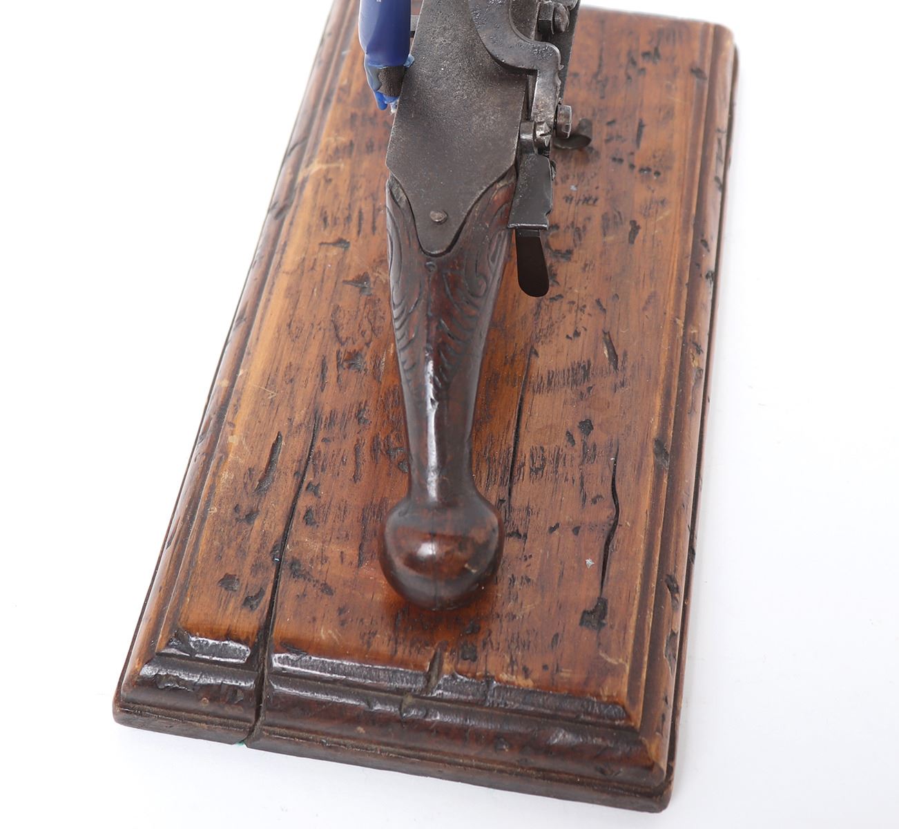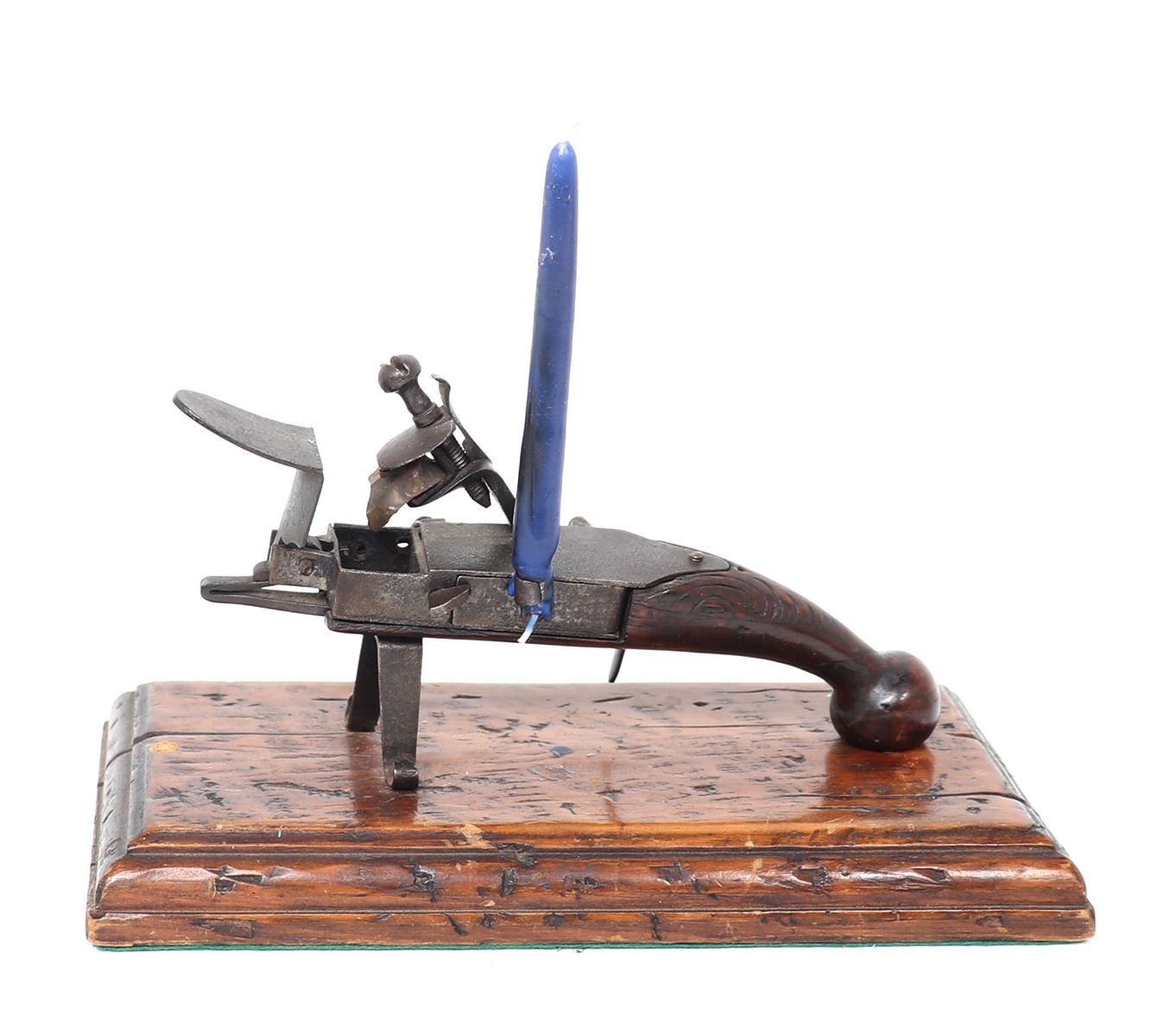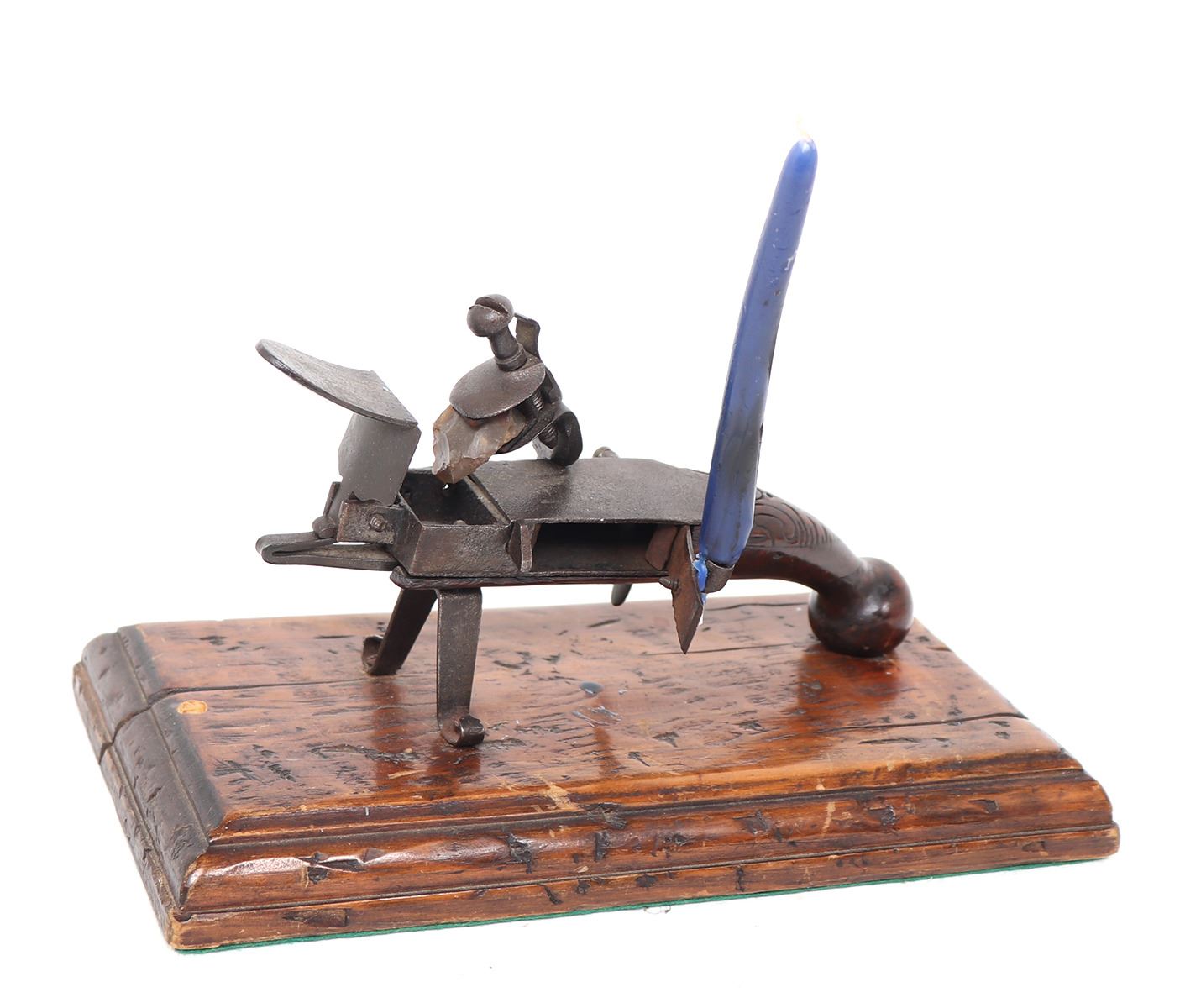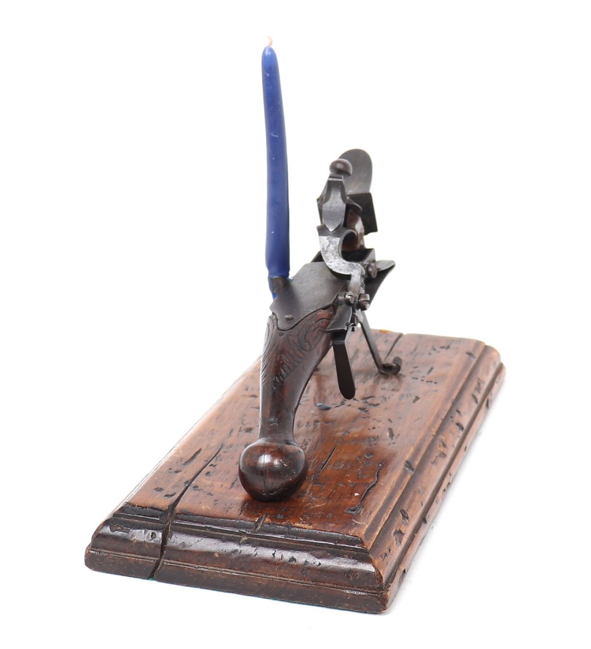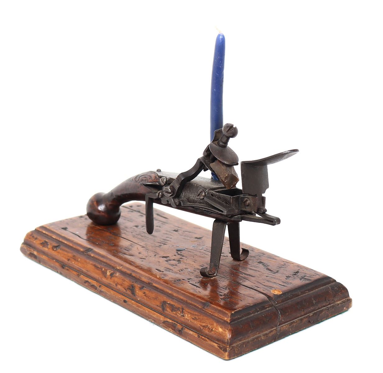 Beautiful desktop stand mounted Flintlock tinder lighter with candlestick, circa 1700's. Iron action, external mechanism, and carving to stock. Size lighter 8" L, base 10" L x 5" W. Condition: Good condition with a distressed and stained wood base.. Provenance: Private USA Collection, English Collection-prior