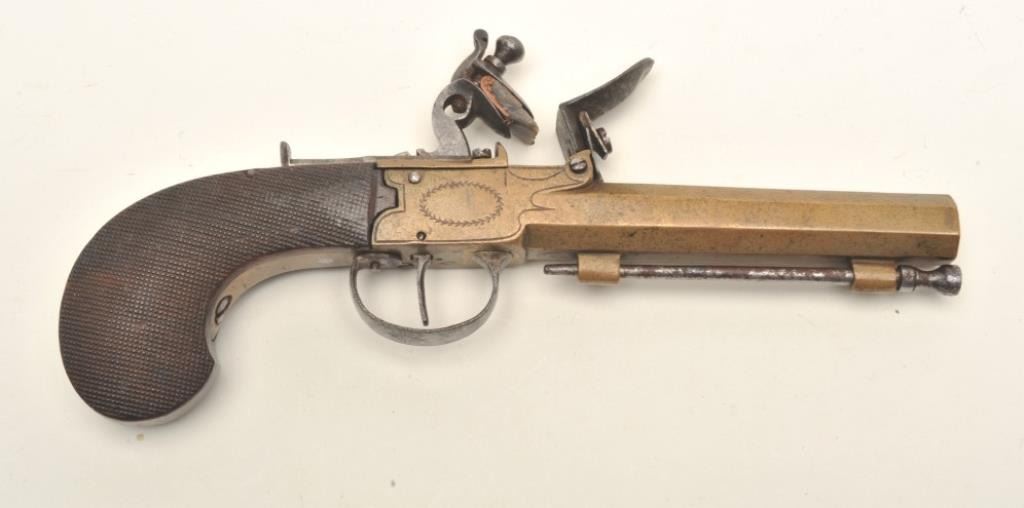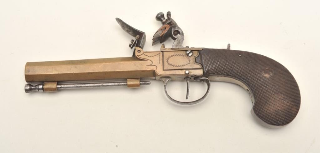 Flintlock brass single shot French pistol, .54 caliber, 4.5” octagon barrel, checkered wood grips, ca. early 19th Century, in overall good condition with a pleasing dark patina to the brass surfaces, crisp action,overall good grips with some minor old compression spots to checkering. (Antique). Est.: $350-$700.