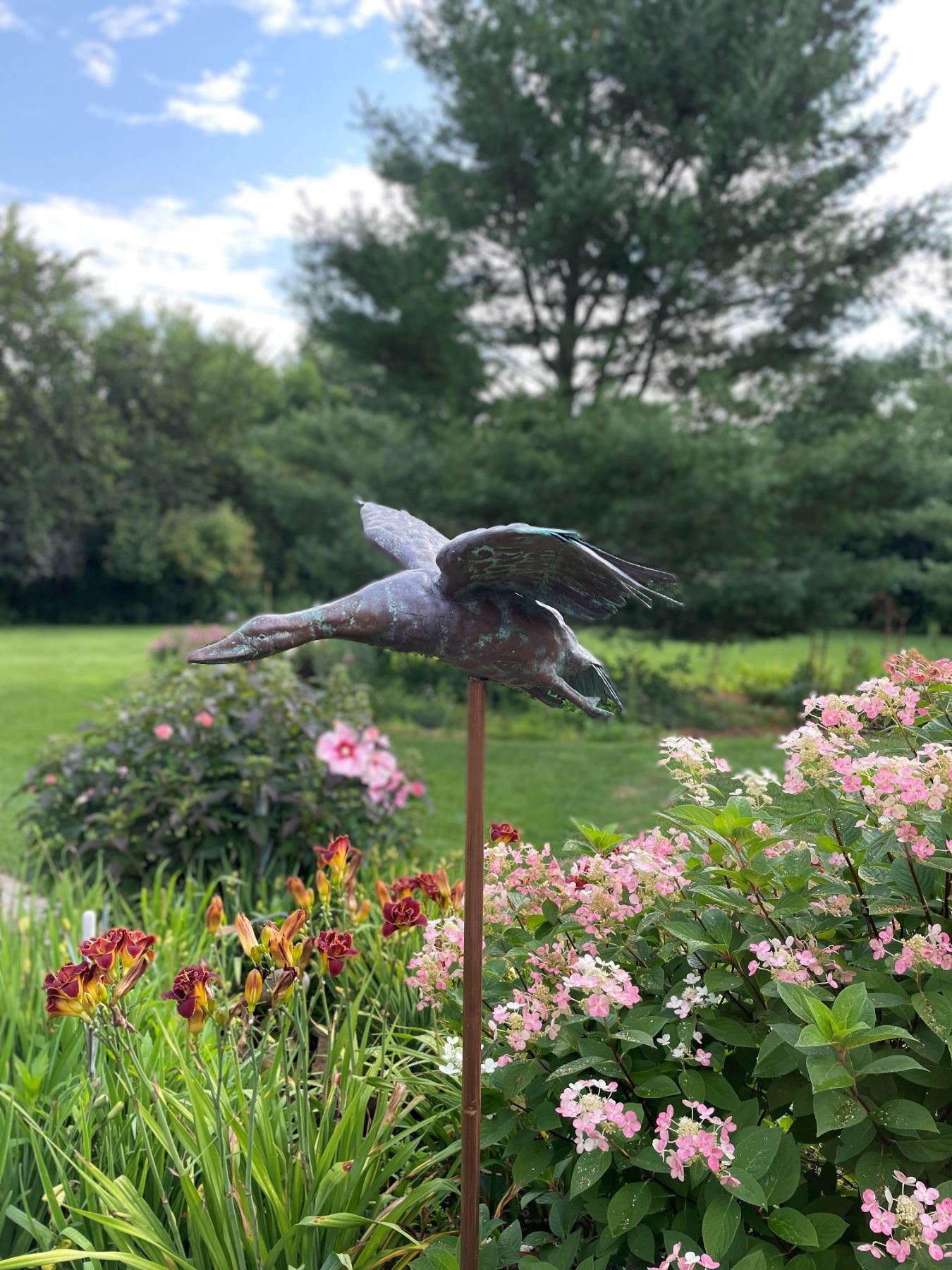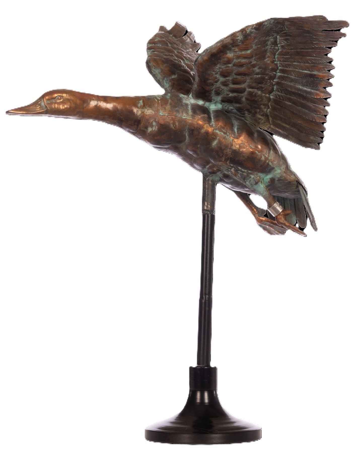 The Flying Mallard is a stunning sculpture crafted from aluminum with a beautiful copper finish and patina,capturing the graceful elegance of a mallard in flight. A duck band on the leg showcases the duckhead logo,Ducks Unlimited, and the establishment year of 1937, adding an authentic touch. This exquisite piece includesan adjustable metal pole with both a ground stake and a stand, making it versatile use for garden or patiobringing a timeless charm and natural beauty to any setting.