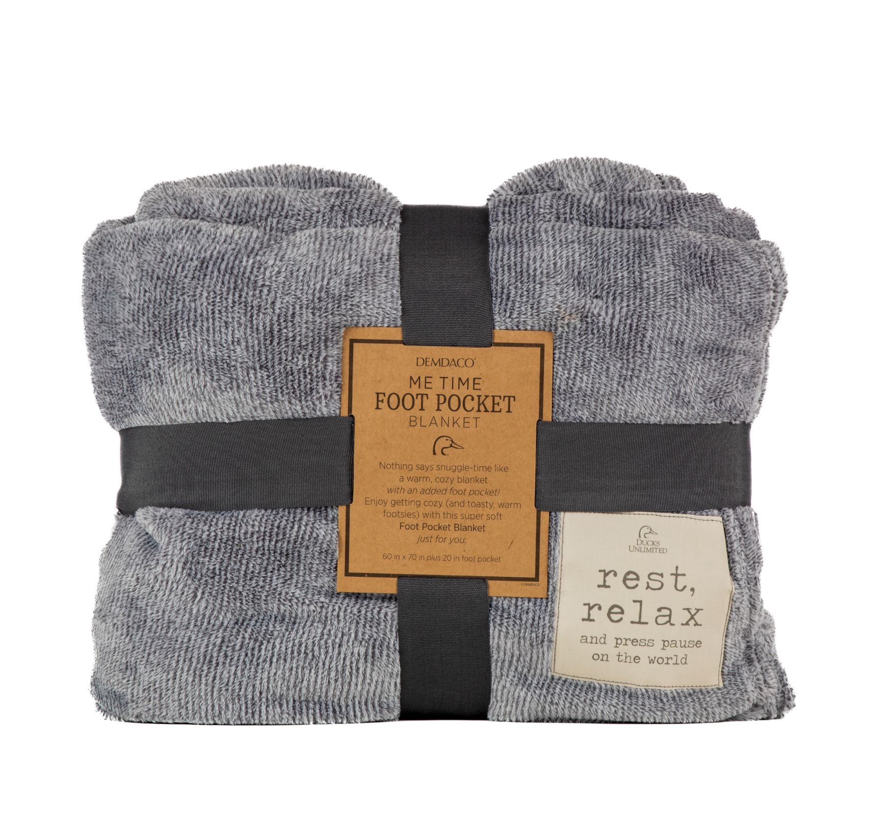 Oversize fleece blanket that includes a 20” pocket for your feet. The soft blanket is Gray and White with mini stripes. Cream color patch that includes the duckhead logo and a quote “rest, relax, and press pause on the world”. Measures 60” x 70”.