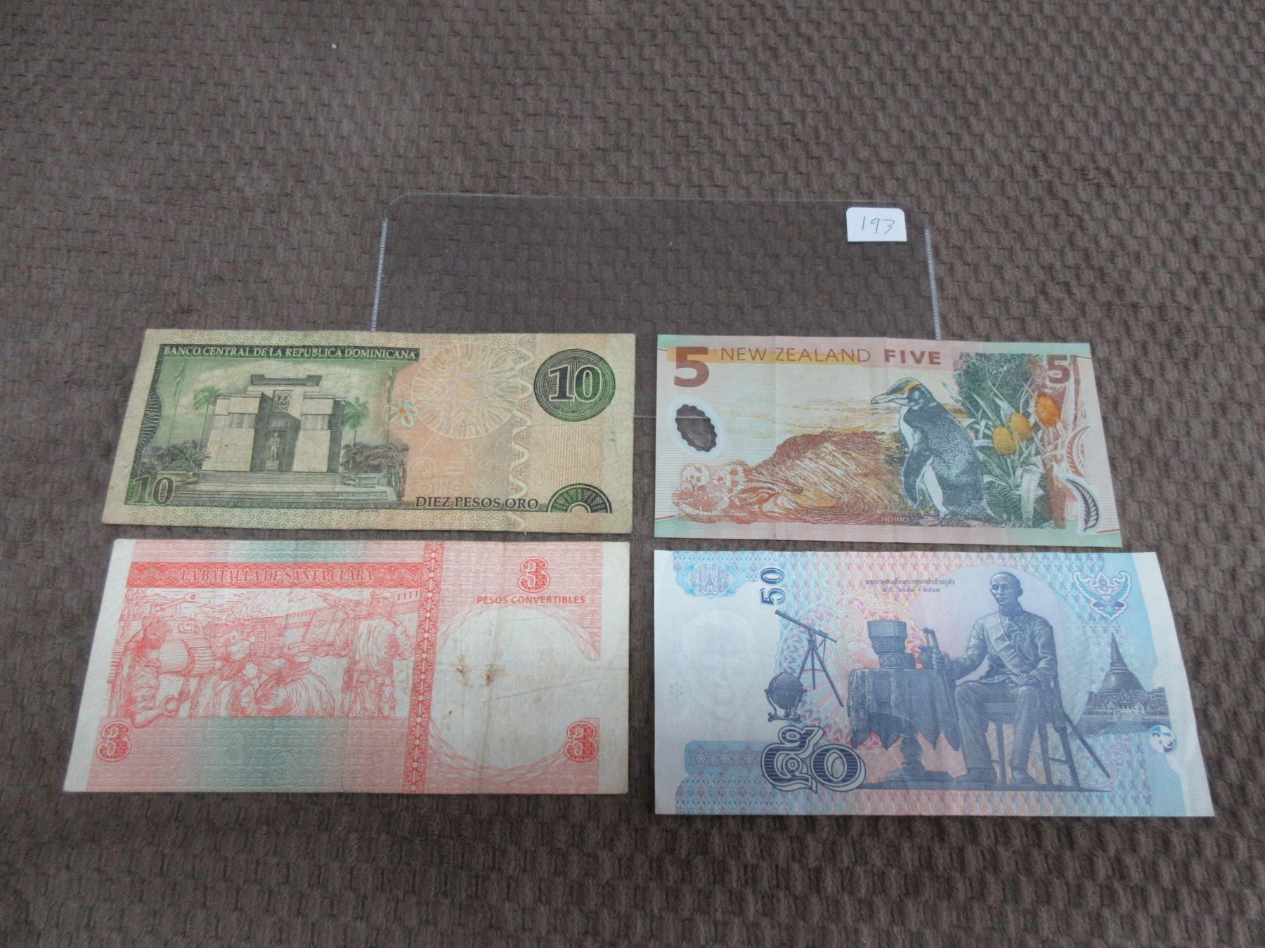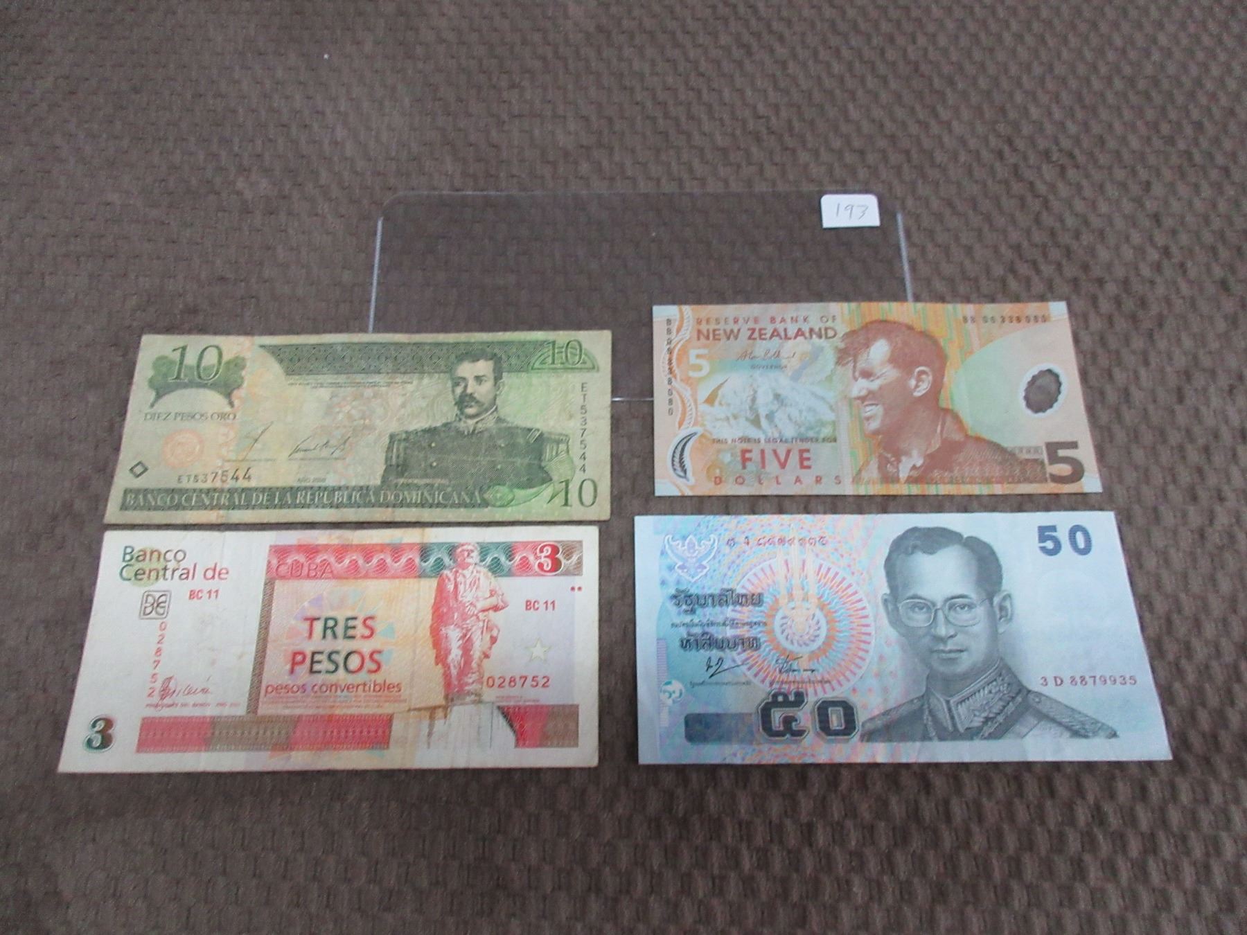 Foreign Currency - Cuba 3 Pesos, Dominicana 10 Pesos, Thailand 50 Baht & New Zealand 5 Dollars
