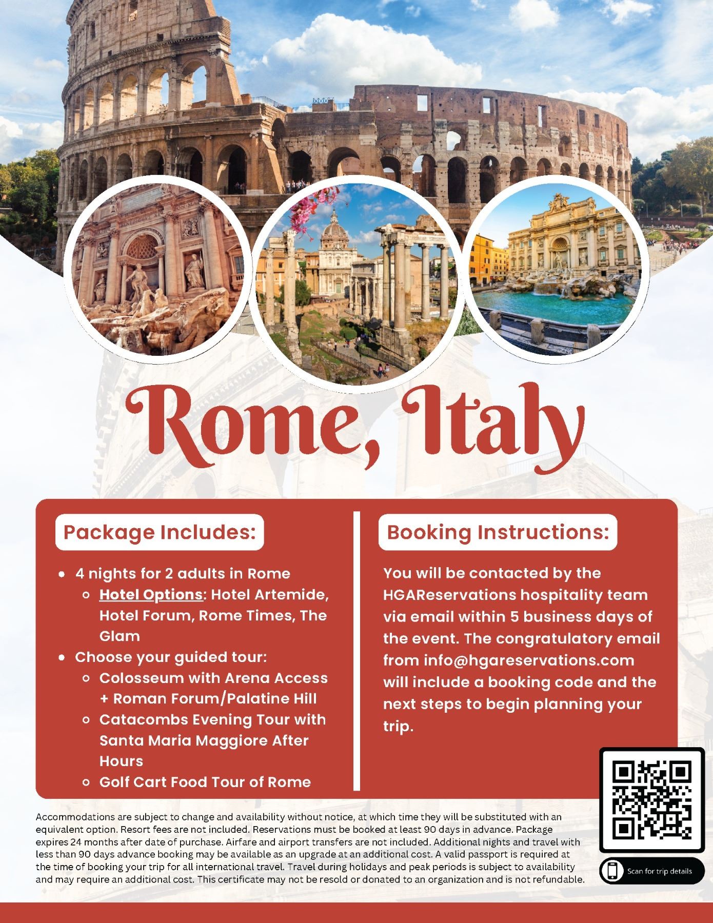 Accommodations are subject to change and availability without notice, at which time they will be substituted with an equivalent option. Resort fees are not included. Reservations must be booked at least 90 days in advance. Package expires 24 months after the date of purchase. Airfare and airport transfers are not included. Additional nights and travel with less than 90 days' advance booking may be available as an upgrade at an additional cost. A valid passport is required at the time of booking your trip for all international travel. Travel during holidays and peak periods is subject to availability and may require an additional cost. This certificate may not be resold or donated to an organization and is not refundable. HGAVacations.com Landing Page Link: https://www.hgavacations.com/rome-italy