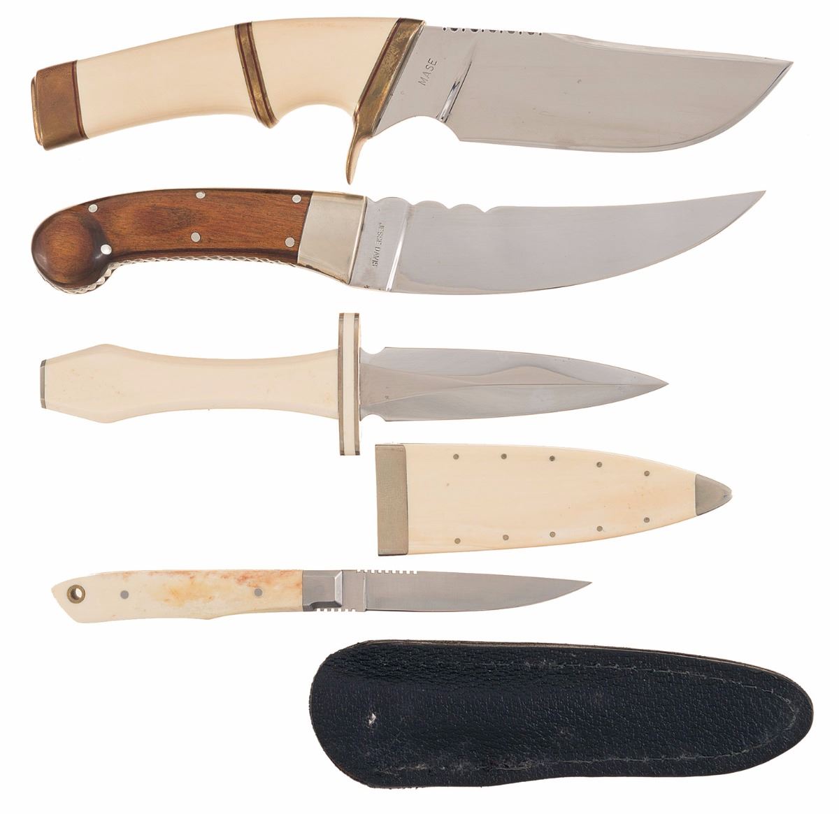 The lot includes: 1) "MASE" signed skinner style knife with a 4 3/4" blade 10" OAL, brass fittings, and smooth ivory grips. Very good with handling marks, and patina on the brass fittings. 2) "JESSE DAVIS signed knife with a 5 1/4" curved single edge blade, 9 3/4" OAL, and smooth hardwood grips. Very good with small handling marks. 3) "SMITH" boot dagger style knife with a 4" double edged blade, nickel silver fittings, smooth coffin shaped ivory grip, and ivory sheath. Very good with light handling marks. 4) Parker Cut Co. knife with a 3 3/8" surgical steel blade, bone grips and a leather sheath. Very good with handling marks.