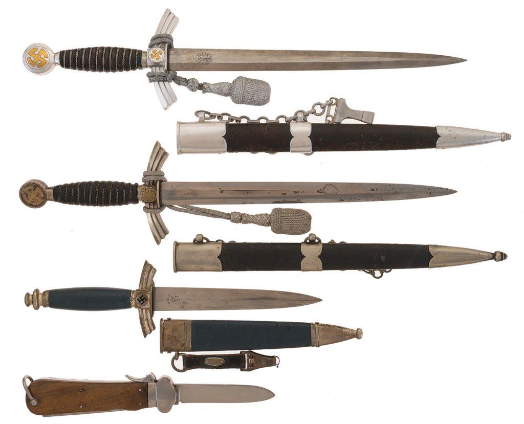 1) Hoerster Luftwaffe aviator dagger, 17 3/4" OAL, 12" blade, alloy fittings, silver portepee, and leather wrapped grip and sheath. Mild spotting. 2) Helbig aviator dagger, 17 5/8" OAL, 12" blade, silver fittings, otherwise as 1. Good with spotting and leather wear. 3) SMF glider pilot dagger, 12" OAL, 6 7/8" blade, nickel guard, leather wrapped grip and sheath. Good. 4) SMF paratrooper knife, 13 1/2" OAL (fully opened), 4" blade, 3 1/4" spike, wood grips. Blade sticks a bit, otherwise good.