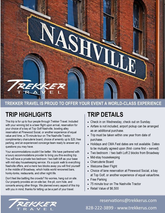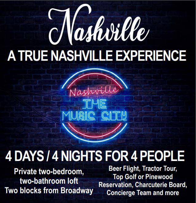 This is a four-day, four-night stay for four people in Nashville! Located two blocks from Broadway, this loft property is among the best, and most convenient for the ultimate Nashville experience. Lofts are two-bedroom / two-bath, and this trip is set up for four people to enjoy. Included with each trip is the use of our concierge team, beer flight upon arrival, charcuterie board, $20 amenities, free parking, 75-minute tour on The Nashville Tractor, reservation for your choice of a bay at Top Golf, a bowling lane at Pinewood Social or another experience of equal value and time. Trips are four days and four nights, check in Wednesday, check out Sunday. Mid-stay housekeeping service included. Value of this trip is $6,500.00