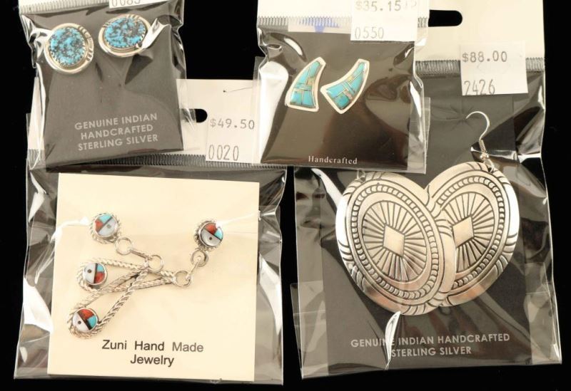 (1) Zuni Sunface post earrings inlaid with mother of pearl, turquoise, coral and jet. Two sterling inlays-one on an open teardrop design. (1) Navajo made hammered silver conchos on french hooks. (1) Pair of natural turquoise nugget stud earrings set in a simple silver Southwest design. (1) Inlaid pair of turquoise and mother of pearl earrings in a silver shield shape.
