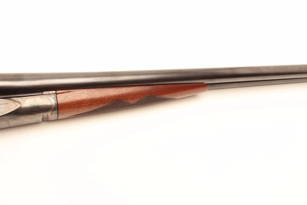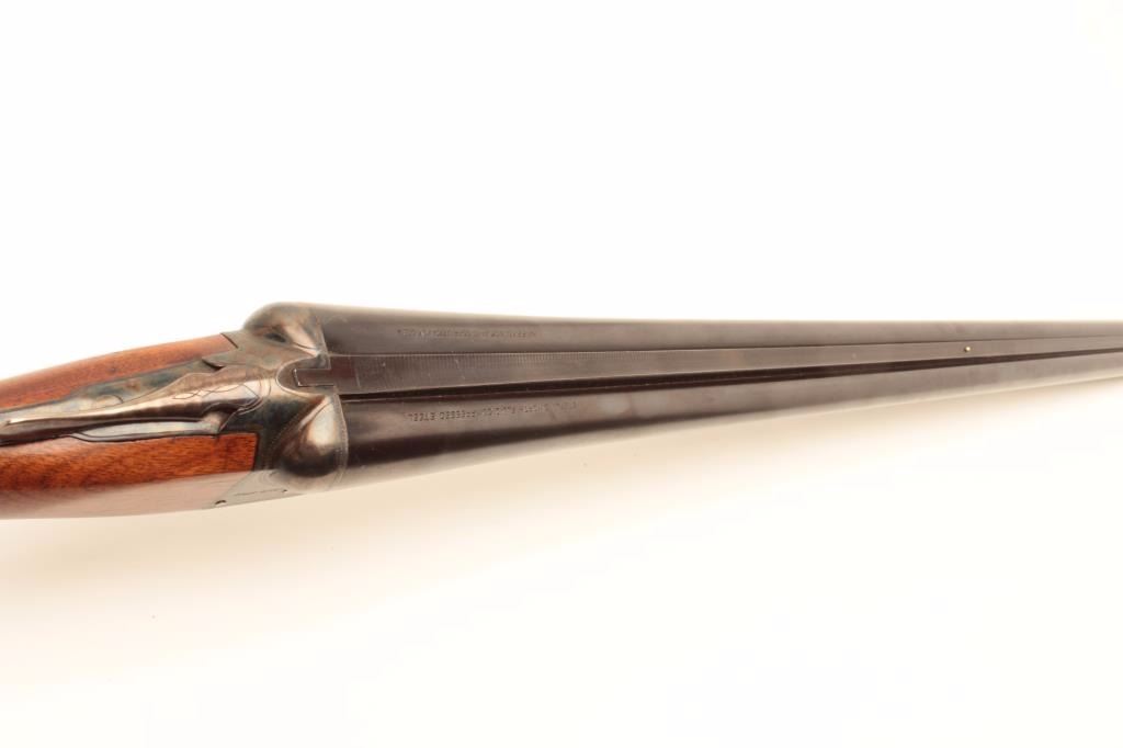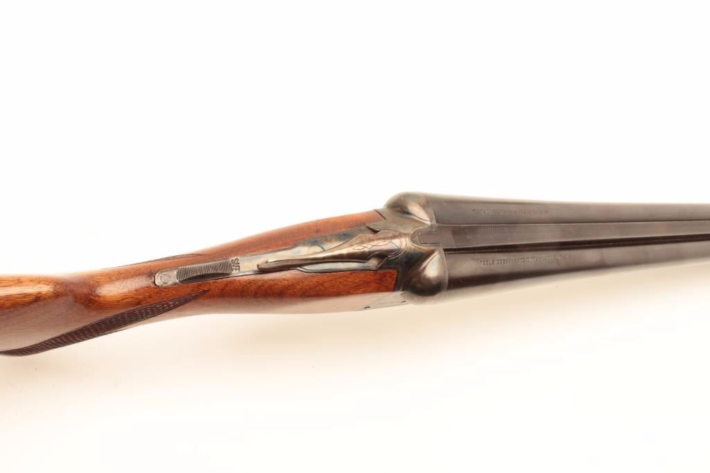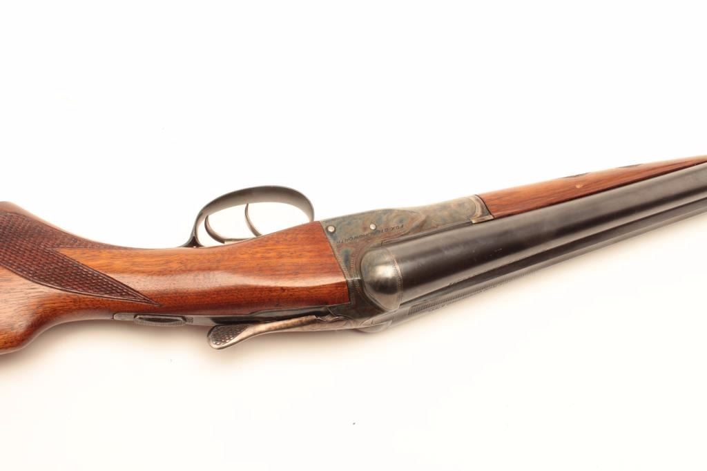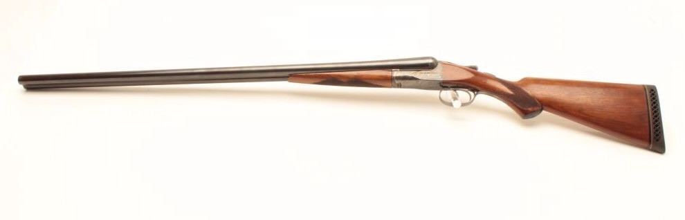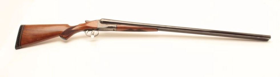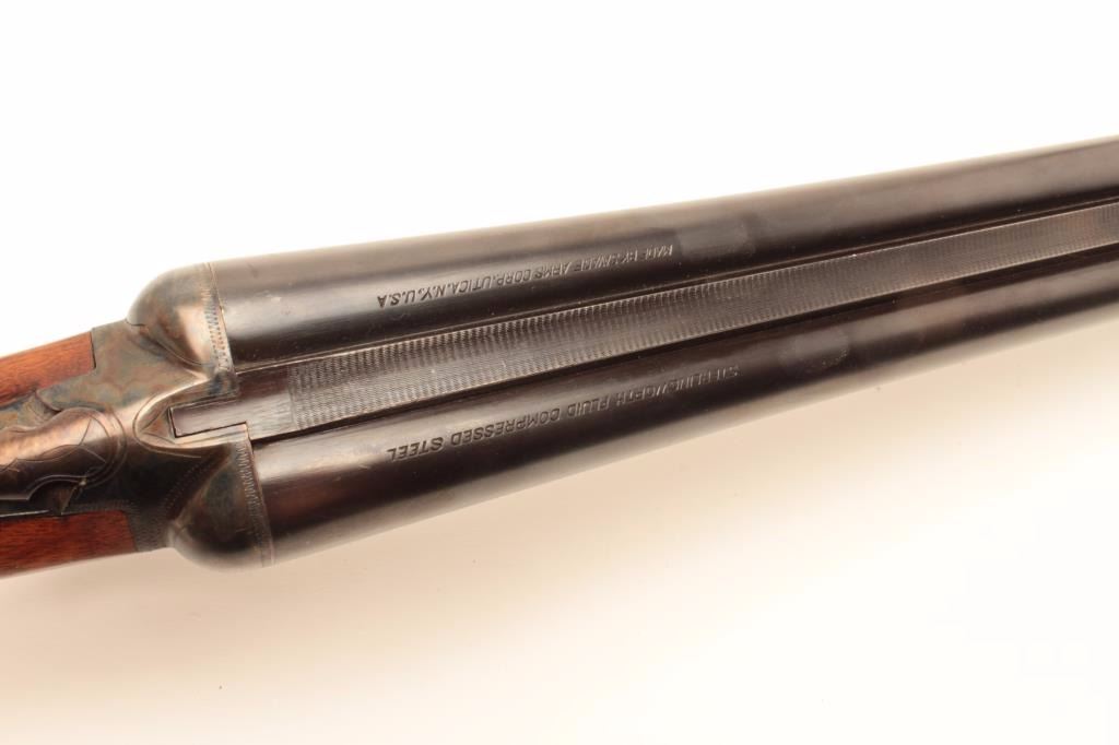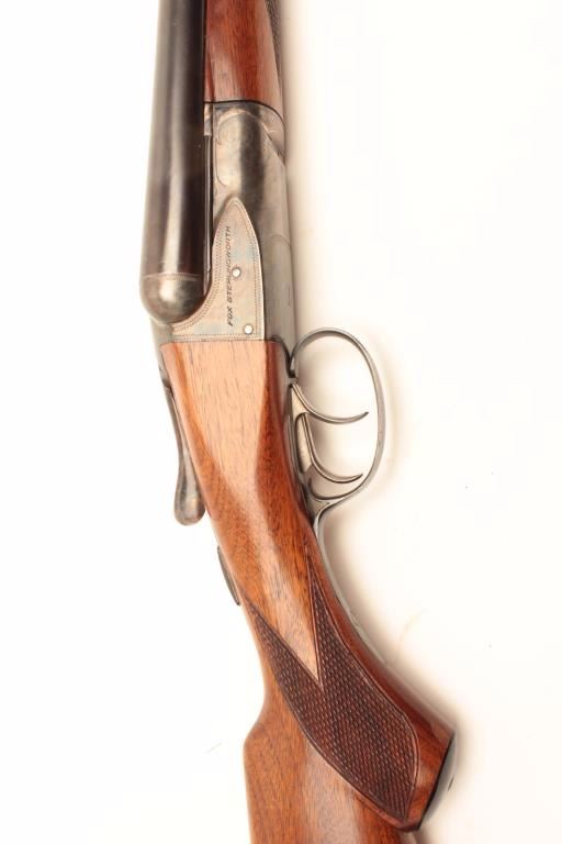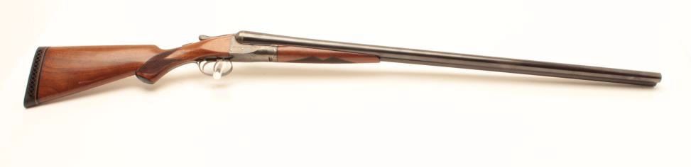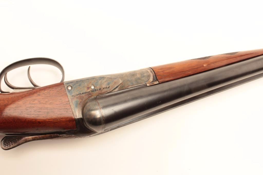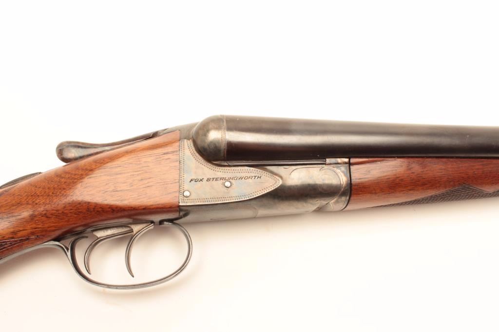 Fox Sterlingworth A.H. grade 12GA SxS shotgun with 32” barrels in fine original condition, S/N 122041. Choked full and modified. 90%-95% original blue and case colors. Very good wood stock with crisp checkering.Excellent bores and locks up tight. Measures 14 ¼” to the end of added rubber pad and 13 ½” to the end of the wood. Standard double triggers and extractors. Very crisp. (C&R) Est.: $1000-$2000
