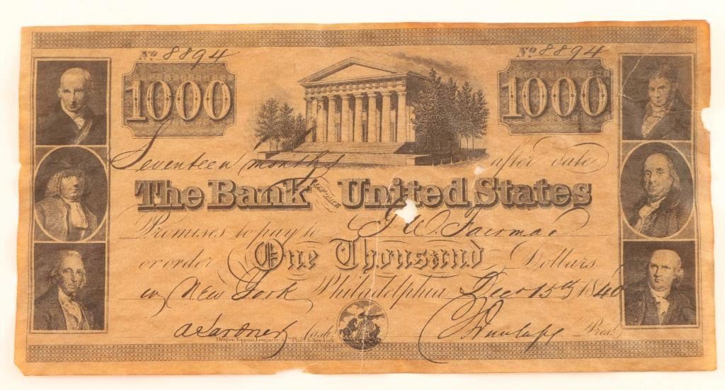 U.S. Bank note #8894. The Bank of the United States issued Dec 15, 1840. Dually signed by clerk and president of the bank. Issued to J.W. Faumar. Printed 1 side only with Ben Franklin and other early American portraits (6 total). Not professionally graded. Shows tatters, small holes and edge losses. Between the Alamo and Mexican War at the time of the western expansion. Why not keep paper money? A $1000 in 1840 at 3% equals approximately $500,000 in 2020.