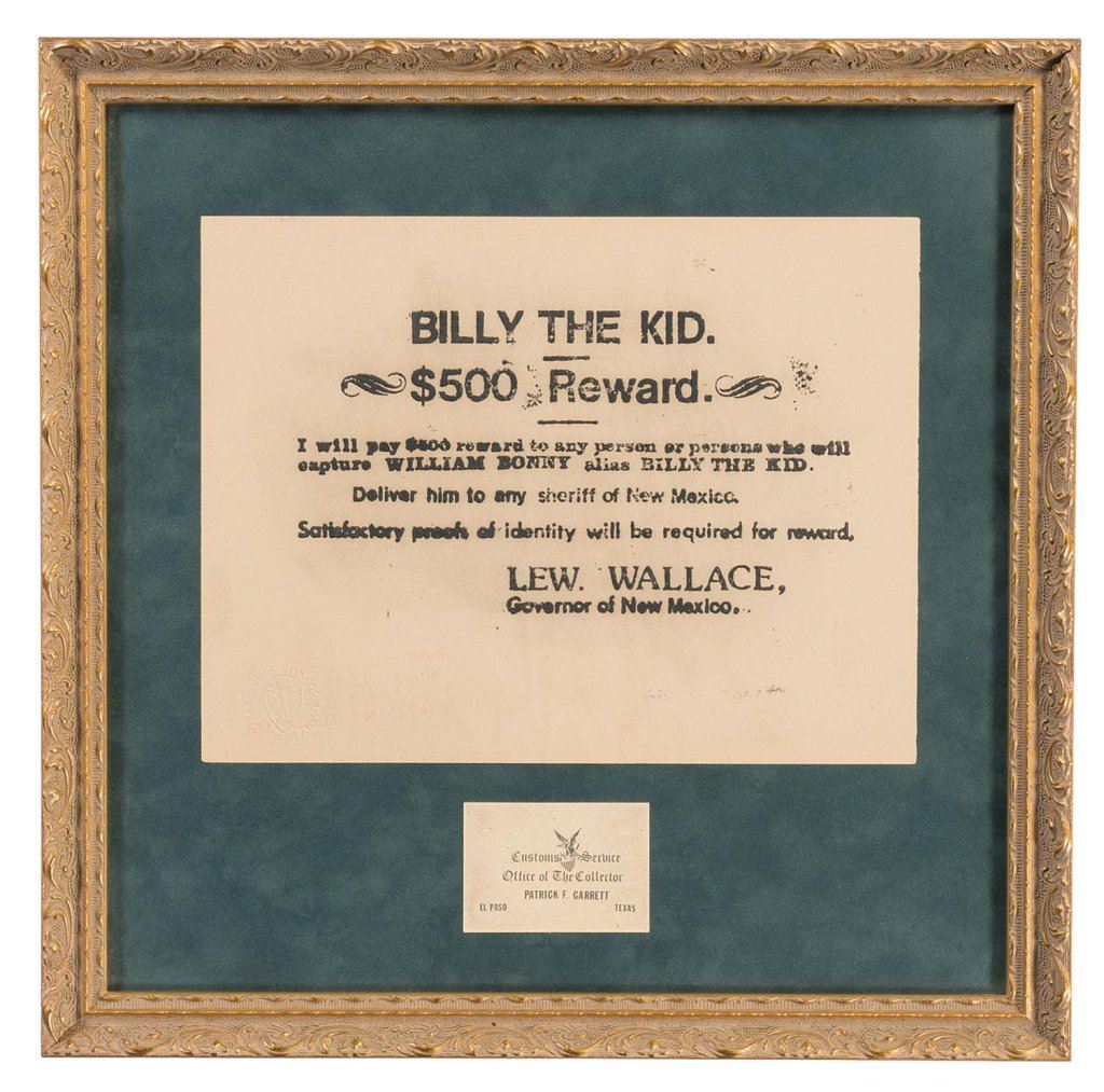 The poster matches identified original reward posters first put out by Governor Wallace of New Mexico in December 1880 and then placed in the papers again in May of 1881. It is 11 3/4" wide and 9" tall and has a seal of the Royal Indemnity Corporation on the bottom left. There is a 3" x 2 1/8" card marked "Customs Service/Office of the Collector/PATRICK F. GARRETT/EL PASO TEXAS" in the frame just below. The frame is 16 1/2" x 17".