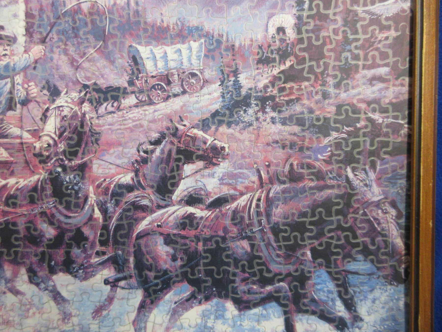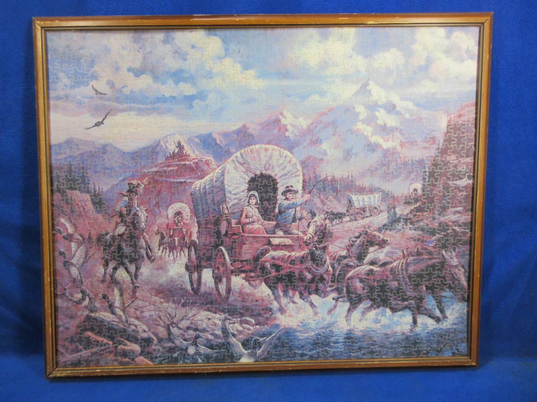 Framed Covered Wagon Puzzle Style Print - Not a Puzzle - 30 3/4" x 24 3/4" - Backing paper is damaged - PICK UP ONLY
