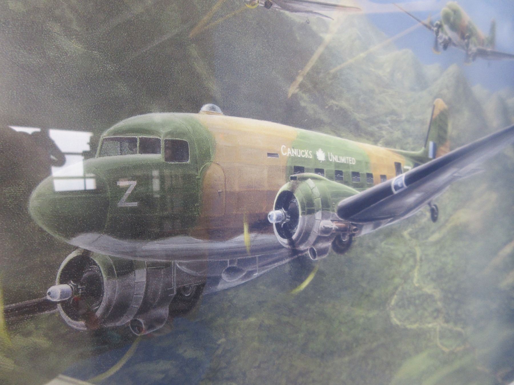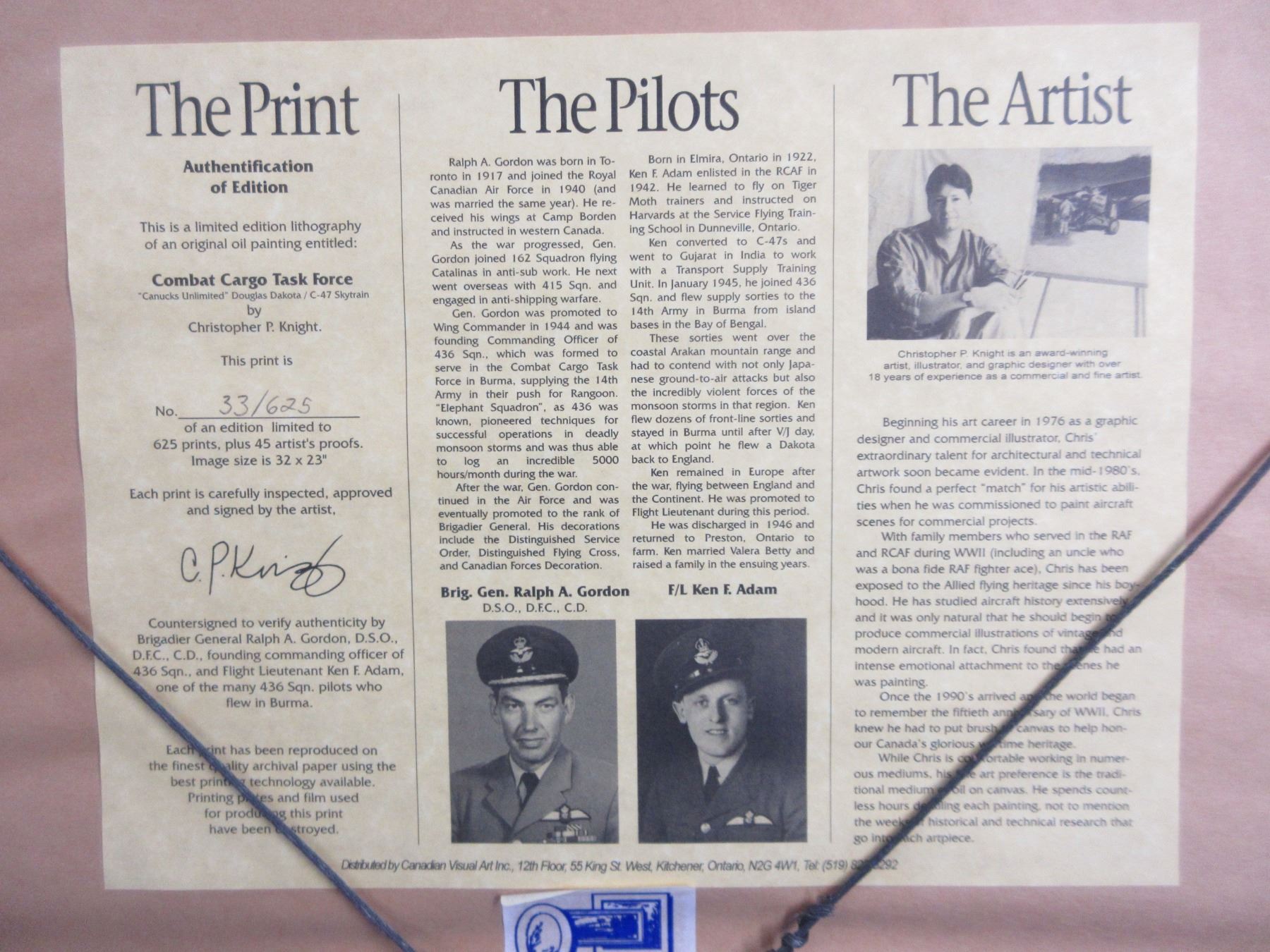 Framed Print - Combat Cargo Task Force "Canucks Unlimited" - PICK UP ONLY - Douglas Dakota/C47 Skytrain - 33/625 - Signed by The Artist (Christopher P. Knight) and Pilot (F/L Ken E. Adam) - 41" Wide x 33" High