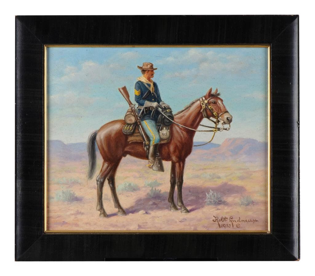 Framed oil painting of an Indian Wars period U.S. cavalryman on horseback by Robert Lyndneux (1953 dated); approx. 10” x 11-1/2”; well-done and proportioned. Est.: $100-$175.