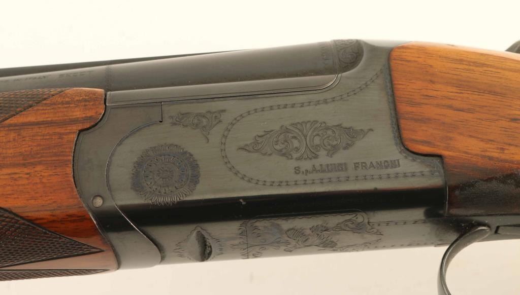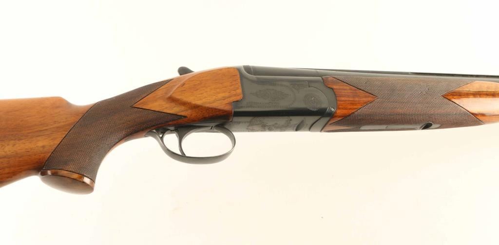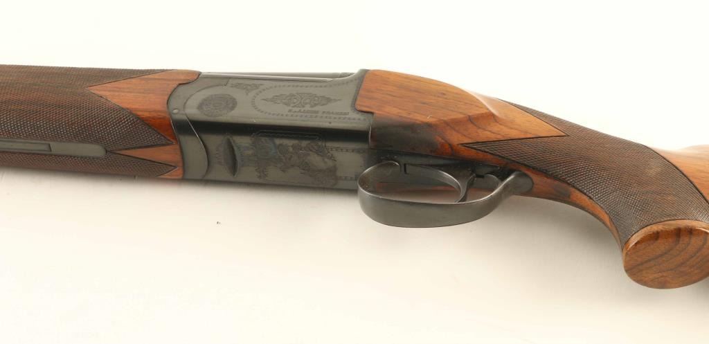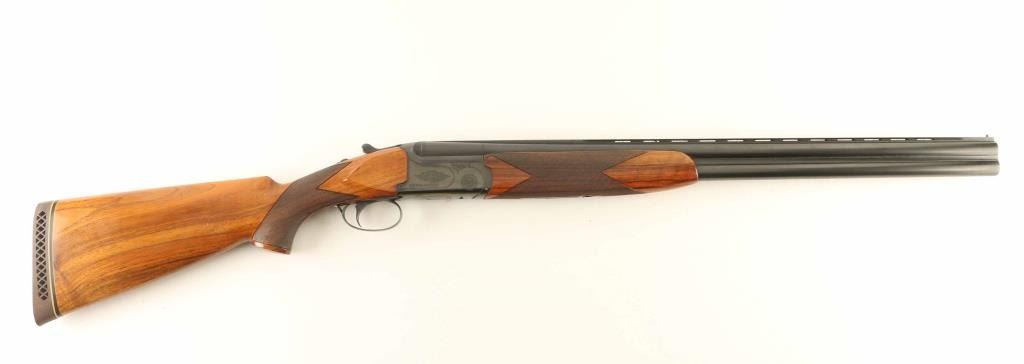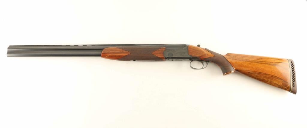 Italian Over / Under shotgun imported by Stoeger Arms Co. Takes 2-3/4" shells. Features blued finish, gloss urethane type finish stock and forend, ventilated rubber recoil pad, pistol grip stock, checkered panels at wrist & forend, 26" fixed choke barrels (both measure IC), single trigger, manual safety/selector, selective ejection, brass front bead. Action displays limited scroll motif engraving, with Pheasant in flight engraved on receiver bottom. Stock measurements: 14-1/4" Length of Pull, 1-3/8" Drop at Comb, 2-3/8" Drop at Heel. Bores are excellent condition. Retains over 90% deep blue with few signs of wear. Wood is very good or better condition with scratches and small dents mostly to butt. Condition is NRA Very Good *** Modern Firearm ***