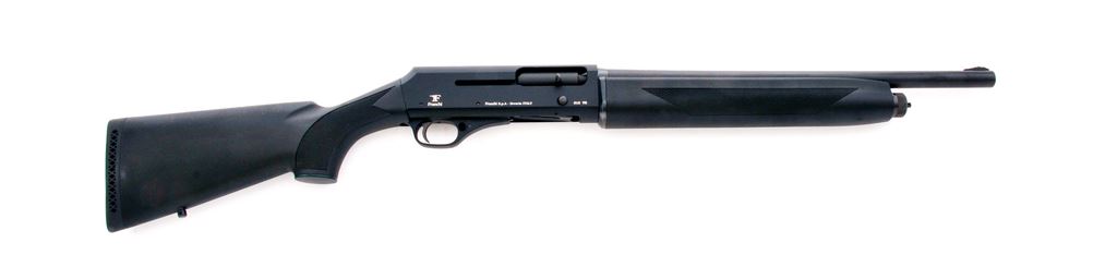 Franchi Model 612VS Defense Semi-Automatic Shotgun, #AH30223, 12 ga., 3'' chamber, 18.5'' barrel, Cyl. bore, matte black finish, checkered pistol-grip black synthetic stock and forend, factory black rubber recoil pad, sling swivel studs, with silver bead front sight. Made in Italy. Imported by Benelli USA. In excellent overall condition showing mostly just light handling marks. Left side of receiver with one light thin scratch, buttstock with some minor surface scuffs, otherwise appearing near new. Excellent action and bright bore that shows only light wear. Est.: $400-$600. (Modern)