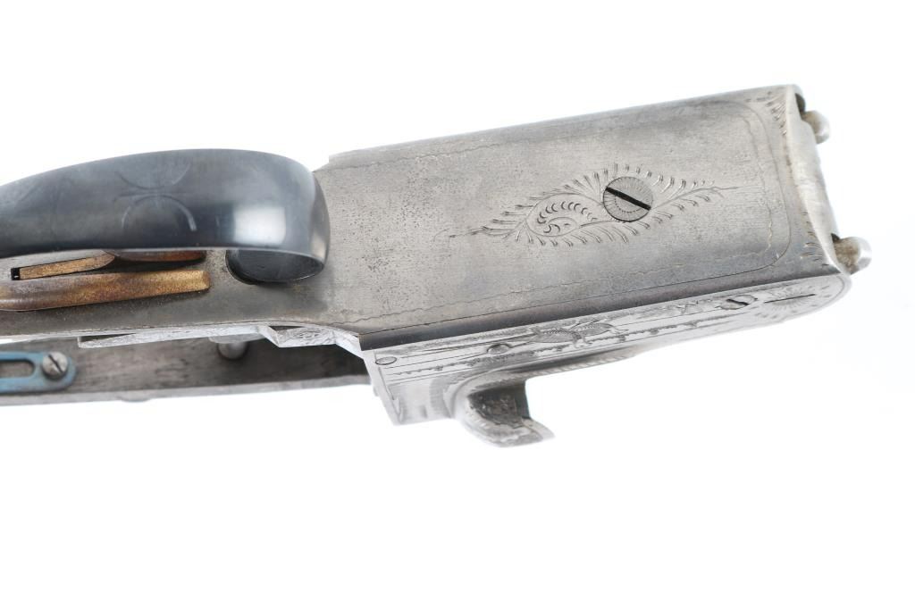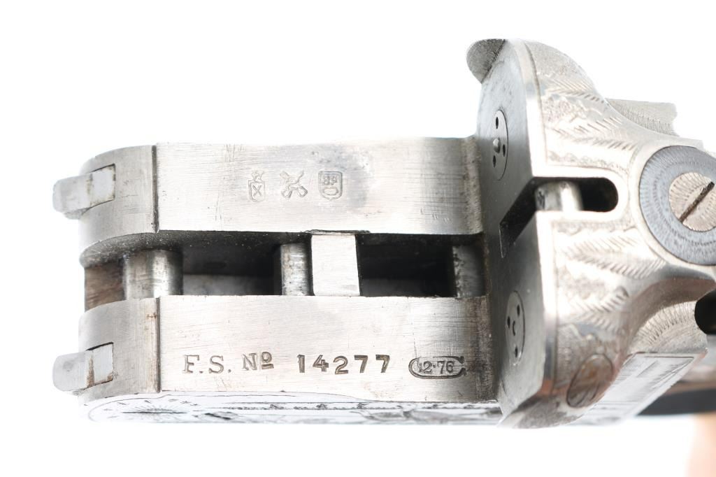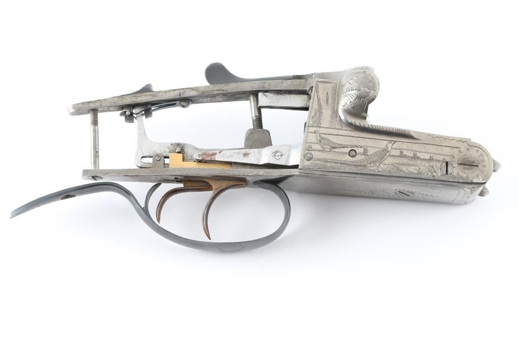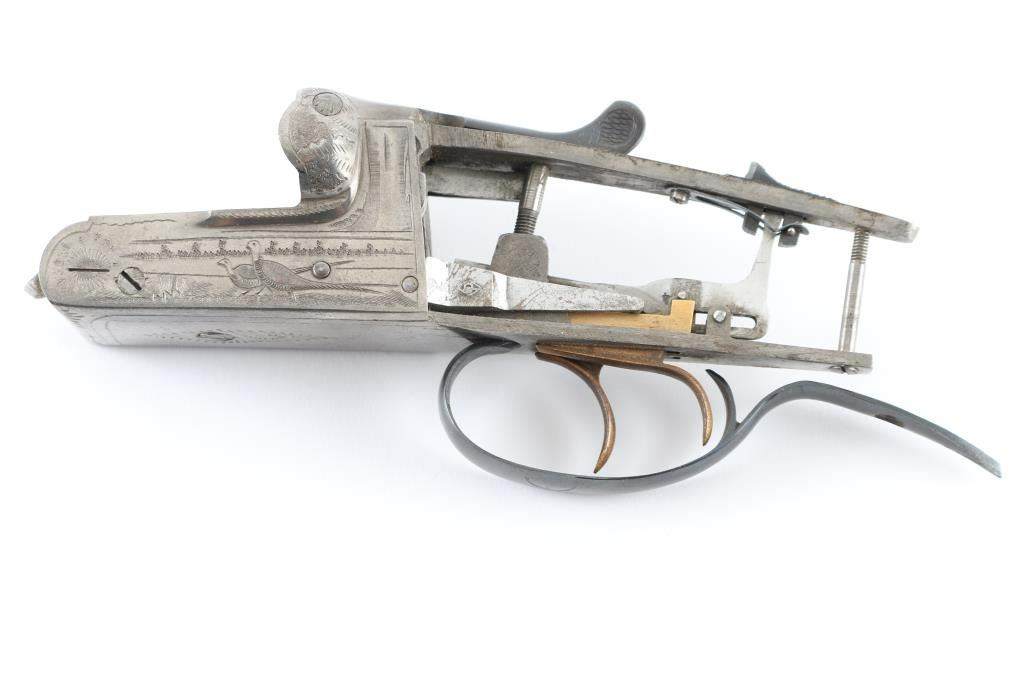 SN: 14277 Engraved Spanish made side-by-side double barrel boxlock shotgun action. Features a Greener style cross bolt, fenced recoil shields, gold double triggers, bushed firing pins. Metal is mostly in the white, with blued triggerguard and top lever. Engraving displays pheasants on sides, with border style patterns around edges, a simple scroll design on bottom, what appears to be large leaves across top/recoil shields. Metal is in very good condition overall. Condition is NRA Good - action only ***Modern Firearm***