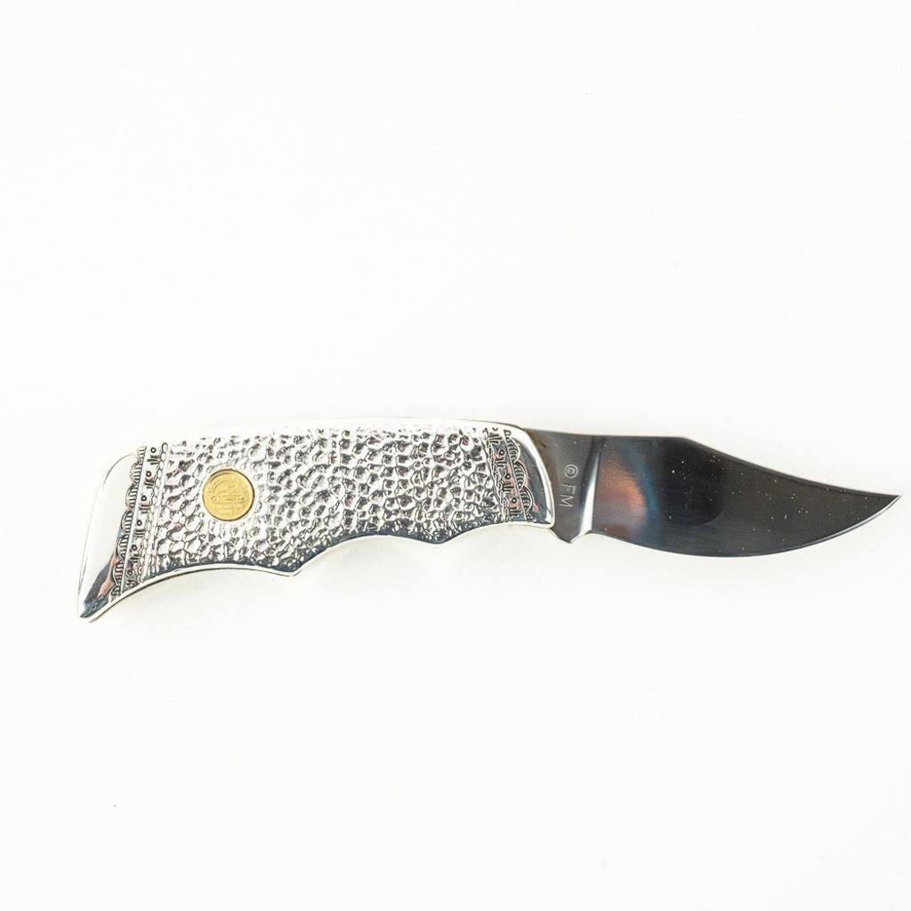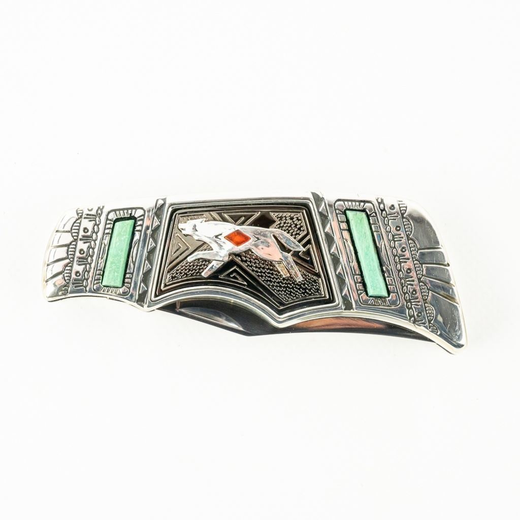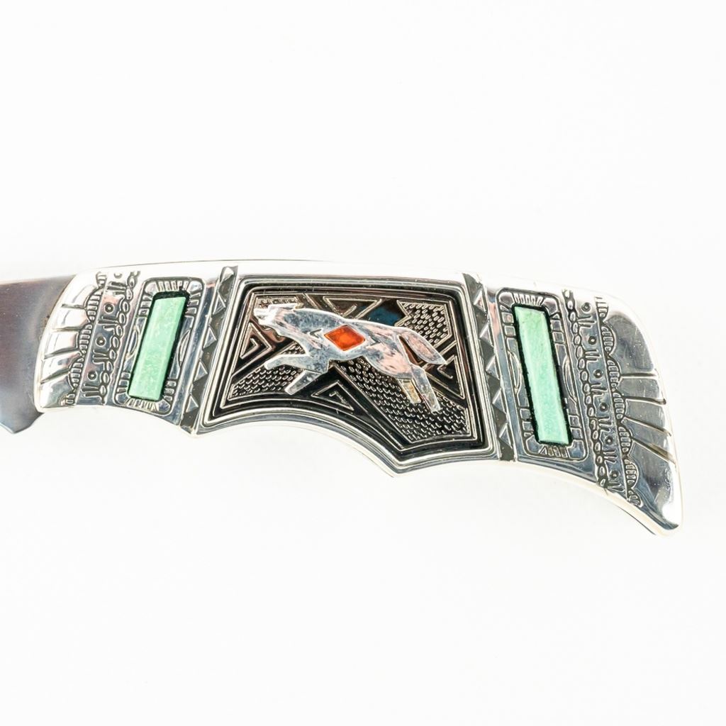 Franklin Mint Collector Series Native American Spirit Animal pocket knife. Knife features Running Wolf Inlay and is highly decorated and engraved. Knife is brand new in zipper storage case. See photos.