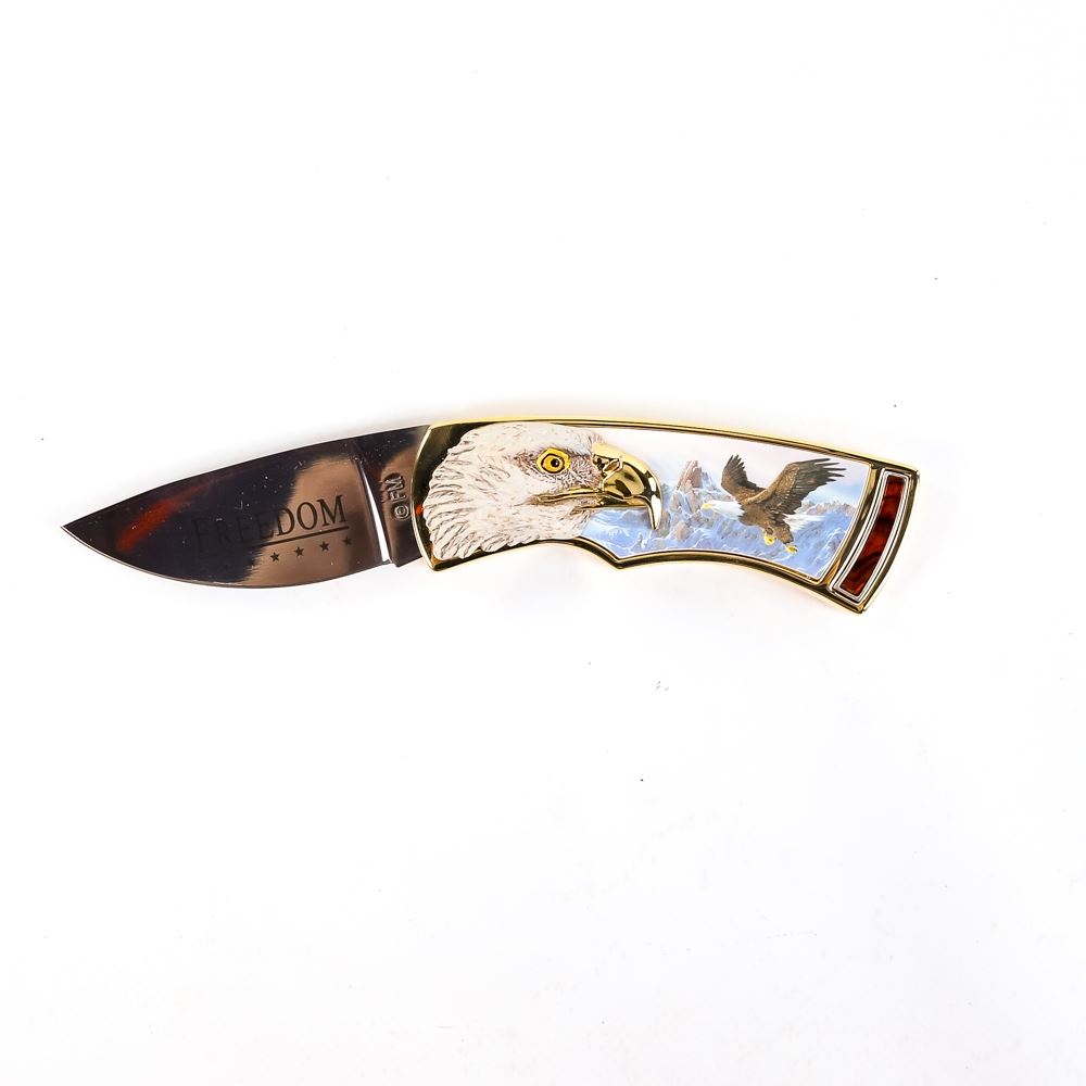 Franklin Mint Collector Series Freedom Eagle Folding Knife. Very Pretty Heavy Gilt Finish with Raised Eagle. Knife is Brand new with Zipper storage pouch. See Photos.