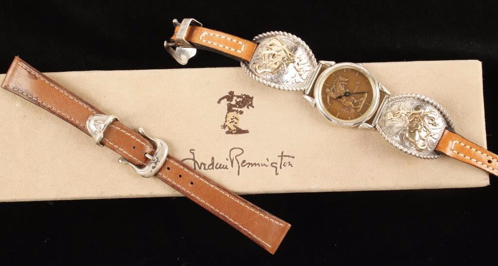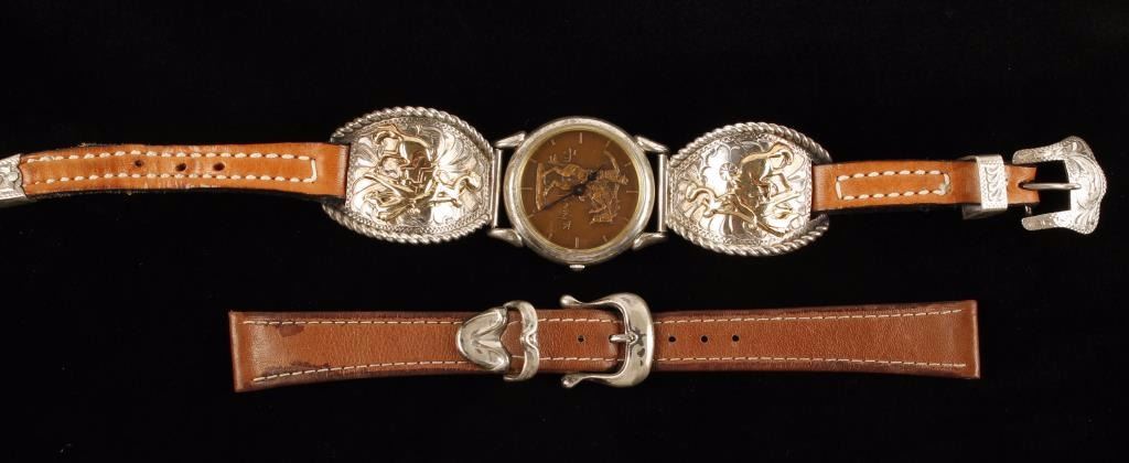 Franklin Mint Co. has bronze face with famous bronc buster design. Sterling silver case, buckle and keeper. Watch has been customized with a Scott Klure sterling silver watchband accented with 14K yellow gold bronc riders. Made by his company-Haraga.