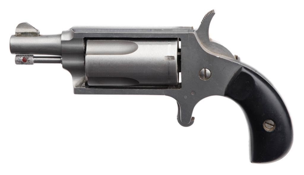 *Freedom Arms 4 shot revolver, .22 Magnum cal., serial #B21980. The revolver is in overall very good to nearly fine condition with a 1 ¼” barrel. The pistol retains nearly all of its stainless finish with only slight wear at the muzzle. The smooth black synthetic grips are in overall very good condition showing only minor handling marks. The bore is very good, the action crisp and markings are sharp on this diminutive pistol. Est.: $100-$200.