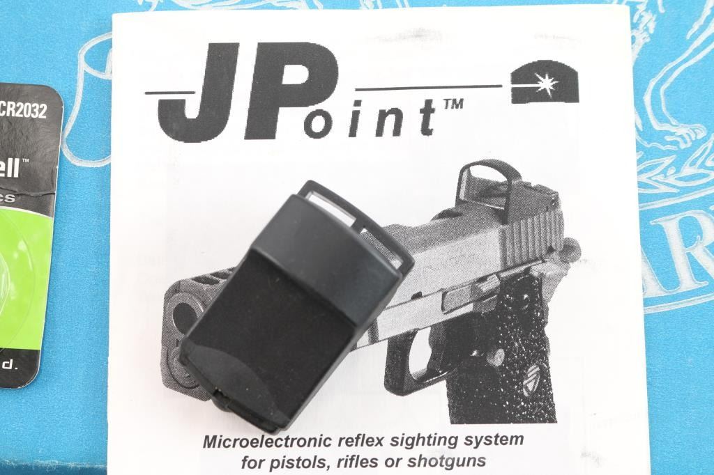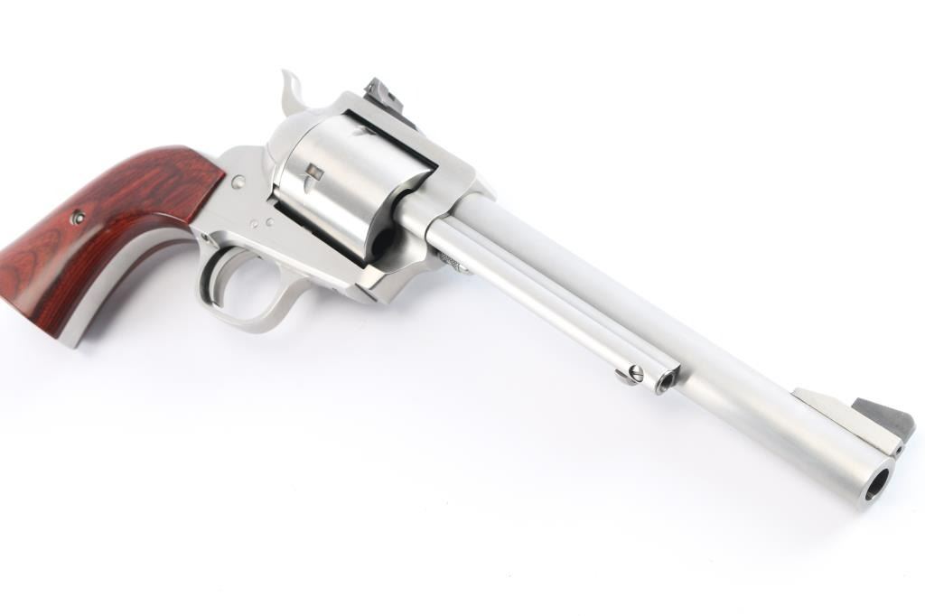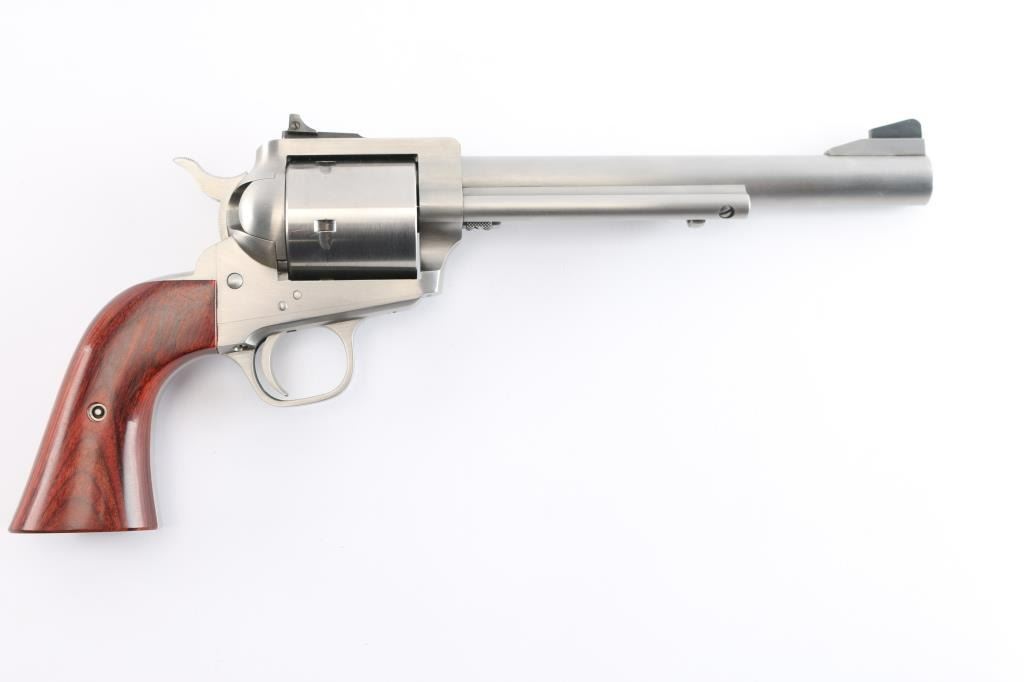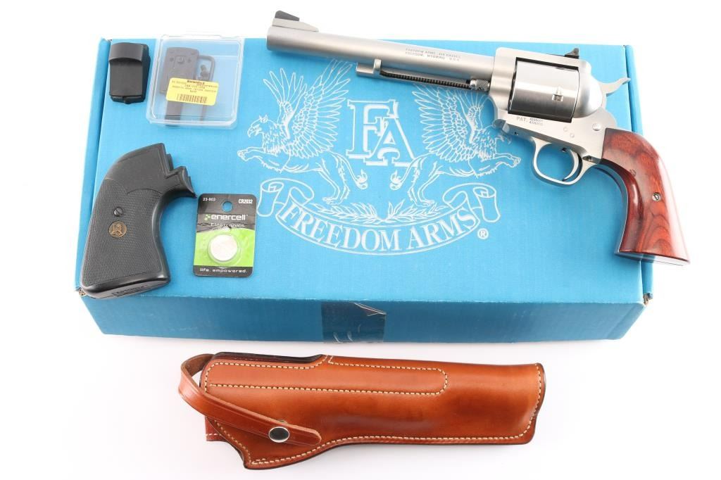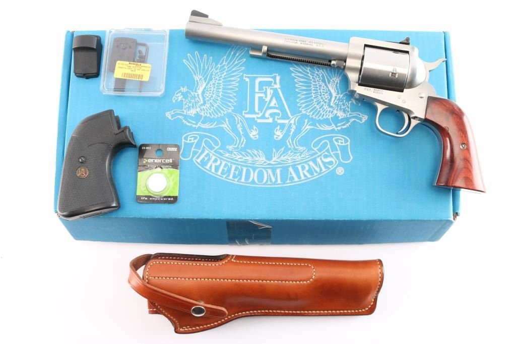 Single action 5 shot heavy duty revolver chambered in .454 Casull manufactured in Freedom, WY. Stainless steel construction with satin finish, unfluted cylinder, a 7 1/2" round barrel, serrated ramped front blade sight, adjustable square notch rear sight, and smooth rosewood grips. It also features a smooth curved trigger, and serrated hammer spur. The finish is excellent at approximately 98% with only one observed scratch under the barrel, and other suprficial scratches. The bore is excellent, and the action is smooth and crisp. It comes with the original box, manual, an extra set of rubber Pachmayr grips, a Brownells optic base, a leather Freedom Arms holster, and a JPoint 4 MOA red dot.