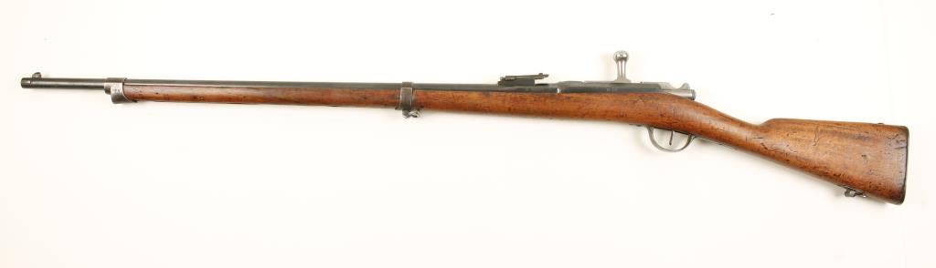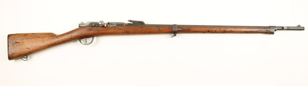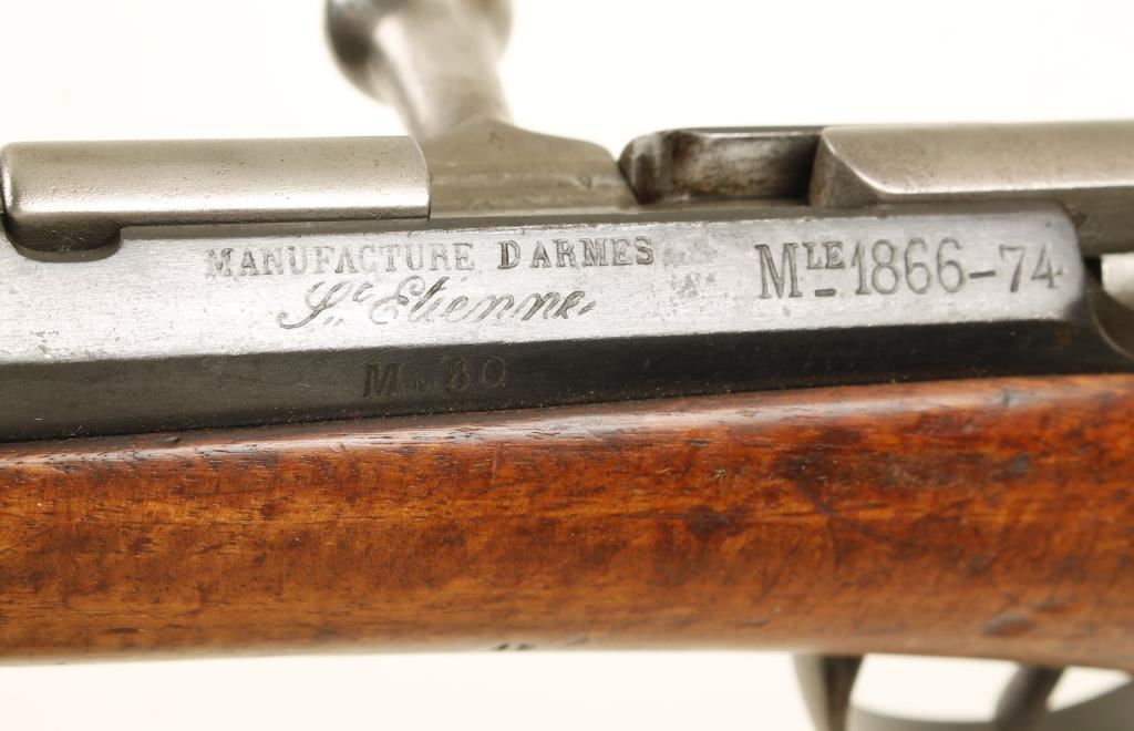 Chassepot 1866 rifle converted to the Gras cartridge in 1874. Blued military bolt-action single-shot rifle with a 32" barrel. Serial numbers don't all match. Metal finish is bluing with wear on edges and exposed areas and with dull surface rust freckling and scratches. Top flat over chamber reads "Made in France". Butt plate is stamped "142T". wood has a serial number stamped on it, a round plug on the butt stock and scads of dings, gouges and scratches. Bore is dark with strong rifling. Action is good. Condition is fair. *Antique Firearm*