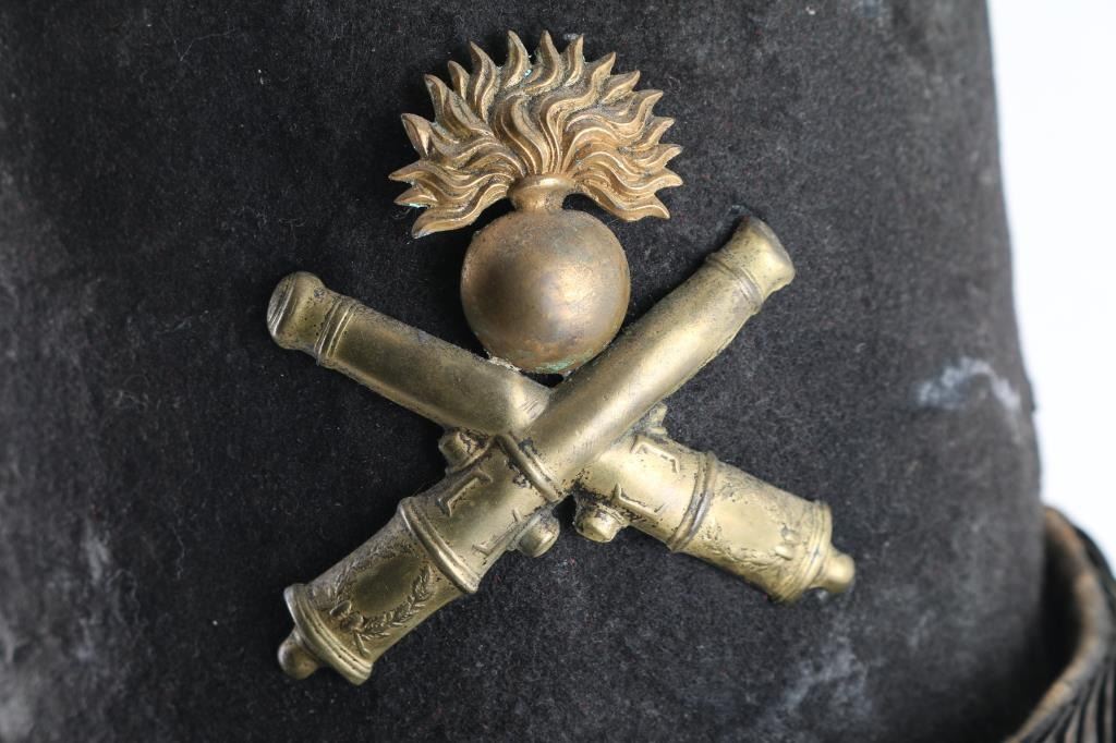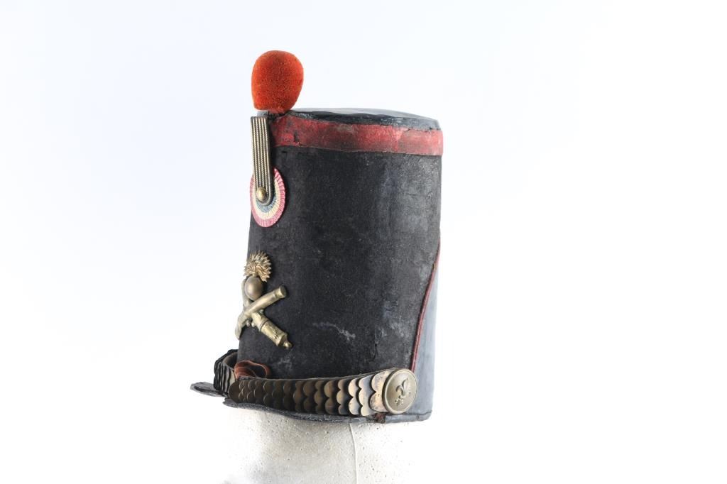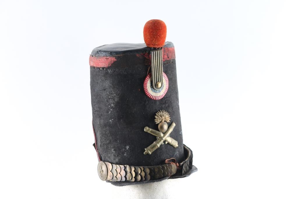 "Stove Pipe" Shako. Cardboard barrel covered with black cloth, 10" height. bordered at the top with a scarlet cloth, with a black waxed leather crown and neck cover at the back trimmed in red and a French tricolor cockade on the front. 2 1/4" in diameter, with a half-bell button in brass at its center, 3" stamped, grooved brass plate from button to crown. Below the roundel are fixed two crossed brass cannons surmounting a flaming bomb. Half moon visor in black leather. Red Pompom in slot. Black leather sweatband under cloth lining. Brass scaled chinstrap with Fleur De Lis bosses. Most of the nap gone, with some staining, the is a 1 1/4" V-shaped piece missing from the middle of the visor. the red band has is fade with discoloration, miss a 3" piece to the left of the Pompom. Overall sound, not to bad for it's age. From the Joe Musso Collection.