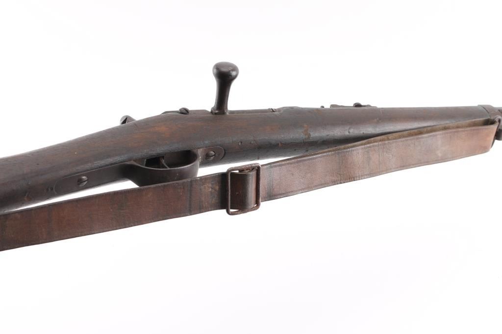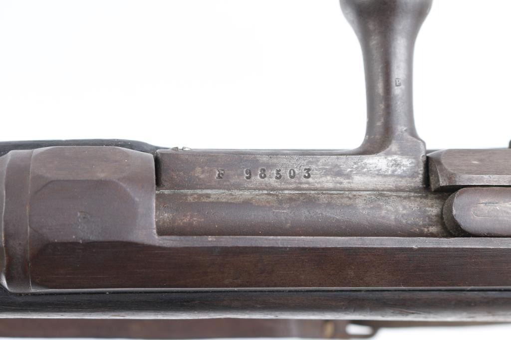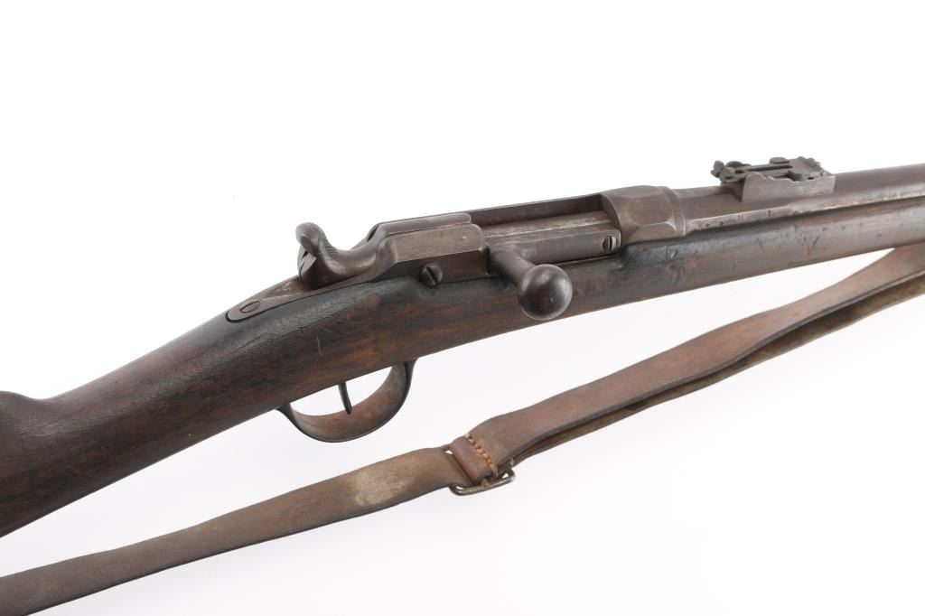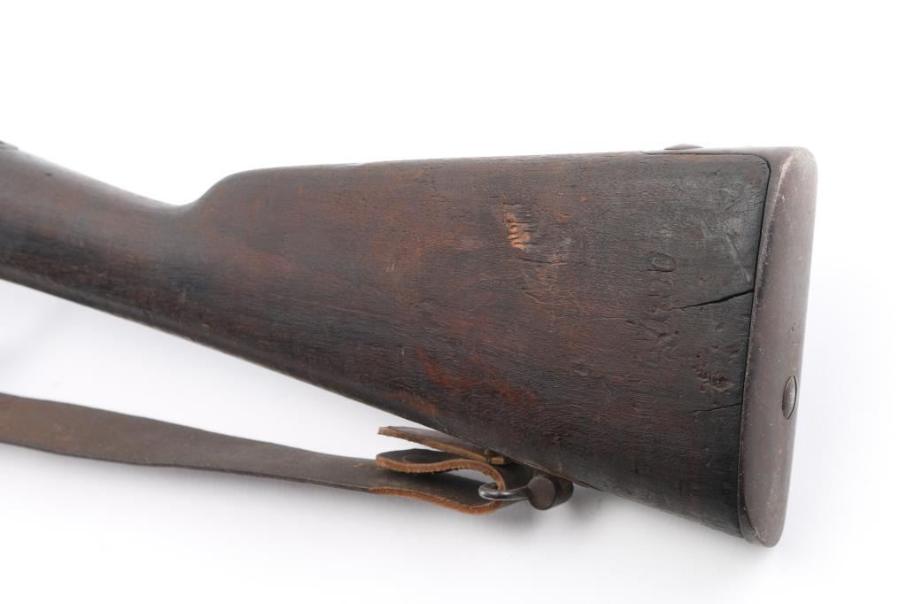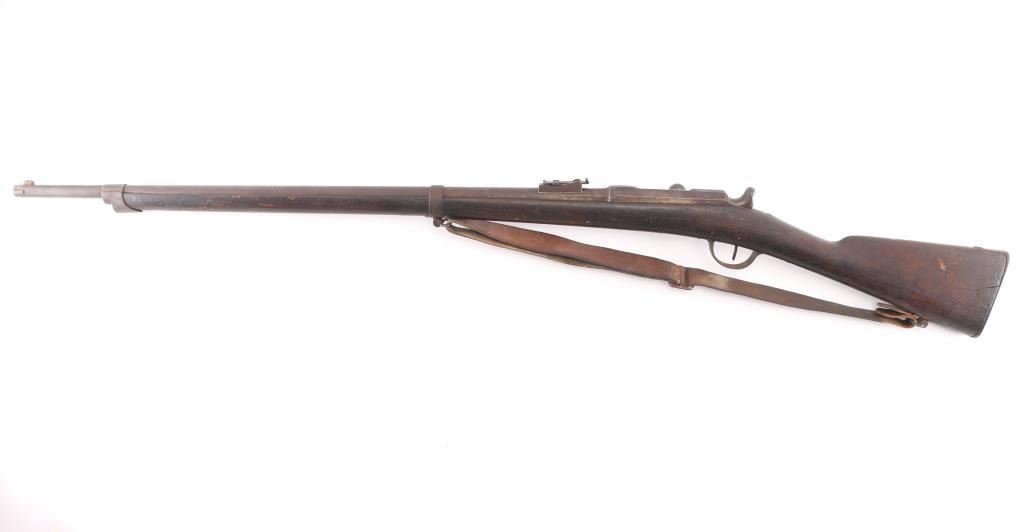 French military Chassepot Infantry rifle, bolt-action, needle fire, breech loading. Manufactured 1868. 31.3" barrel, military sights, bayonet lug. Used in the Franco-Prussian War. There is no visible import mark. The left side of the barrel shank, bolt, top of the bolt handle root, and the cocking piece are all marked with the matching serial number. The bottom of the bolt handle root is marked with small stampings. The barrel shank is marked “AF”, “circled B” & “circled D”, “S.1868” and with several small stampings. Most of the metal parts on the rifle are marked with small French stampings. The buttplate is marked “51”. the roundel on it that contains “S. MARS. D. / MI / 1868” is missing.. The “MI” mark stands for Manufacture Imperiale. Rule of Napoleon III. Missing cleaning rod, no Arsenal marking on receiver, Likely imported at some time. Metal has turned a brown patina. wood is sound with a couple of minor cracks on the left butt stock above the buttplate. Bore is very good with strong rifling. Bolt action is a little stiff, needs oil. Comes with period leather sling. NRA Condition-Good as Antique Firearm.