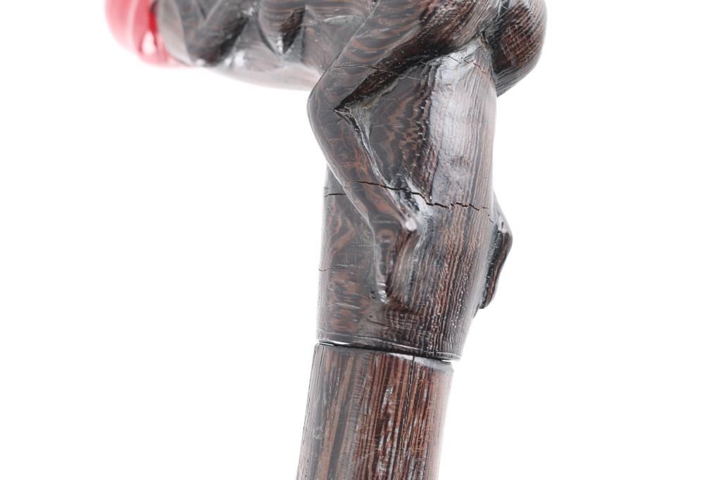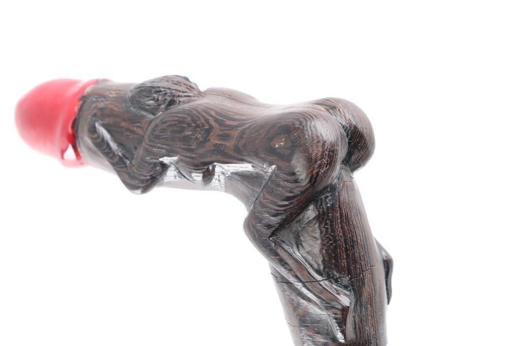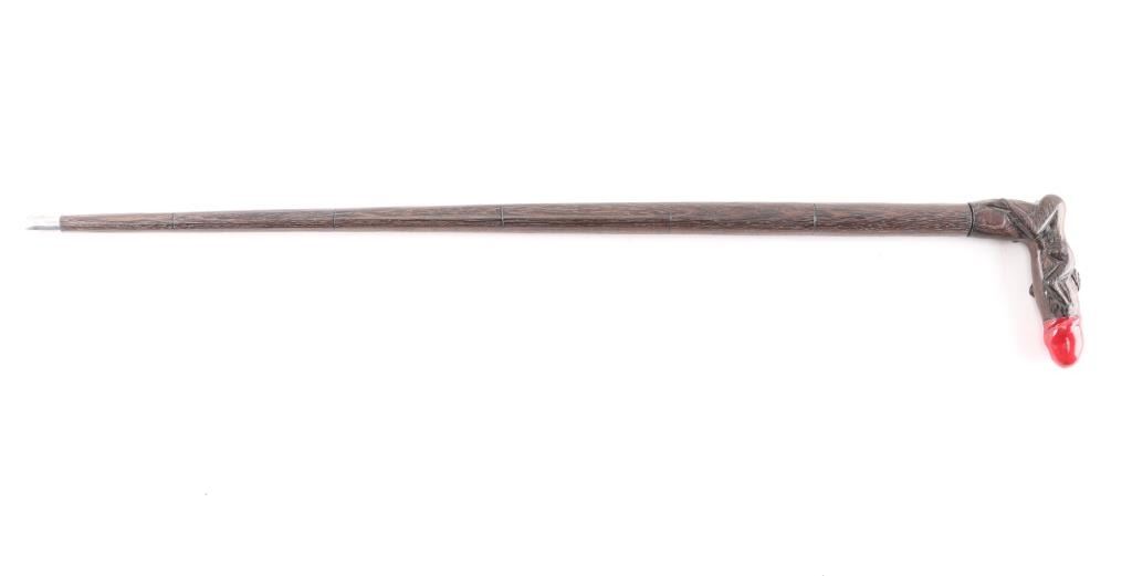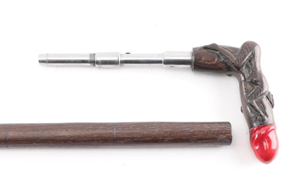 French Erotic cane gun chamber in 9mm Flobert Rim-Fire. Unknown maker. ((Still available today) The handle of the cane is hand carved, shaped like a penis with the head painted bright red with a nude woman clutching it. Remove the handle to reveal a single-shot, breech firing pistol. Screw off barrel to load. Chrome finished, barrel and action measure 7 1/4" from handle, unrifled bore. Unmarked except for "9 FLO" stamped on barrel. 34 1/2" length, handle measures 5 3/4", metal sleeve in pistol compartment, steel tipped, Tip has small dent. Wood is dark brown with vertical grain. Overall very good condition with a couple of hairline cracks on the lower handle.NRA Condition-Fine as Antique Firearm.