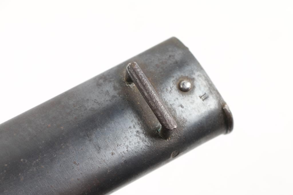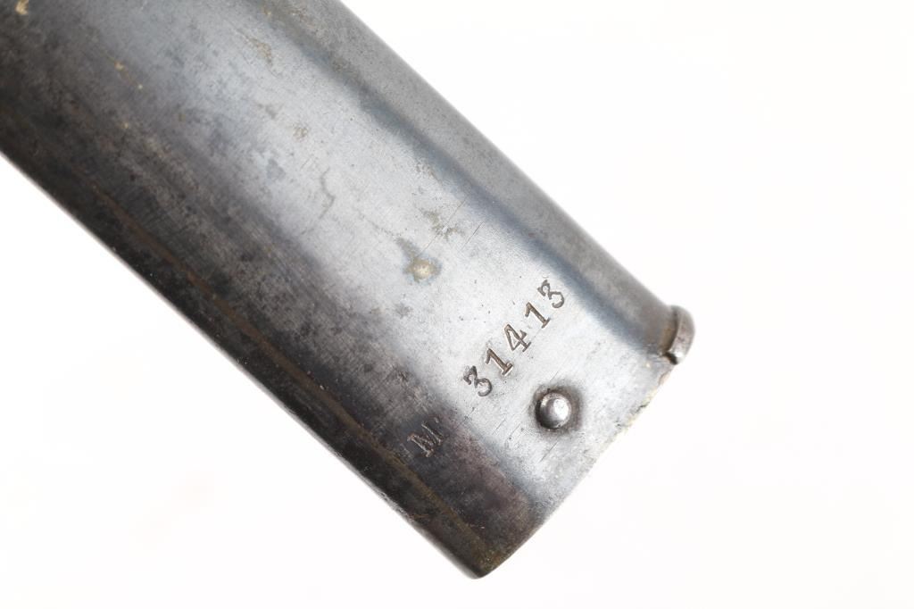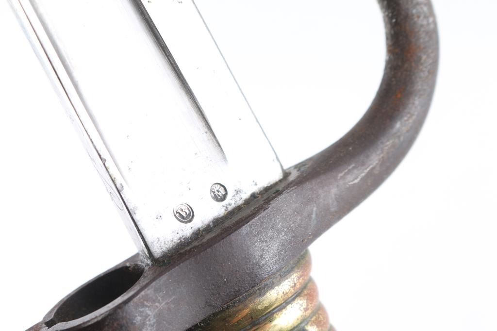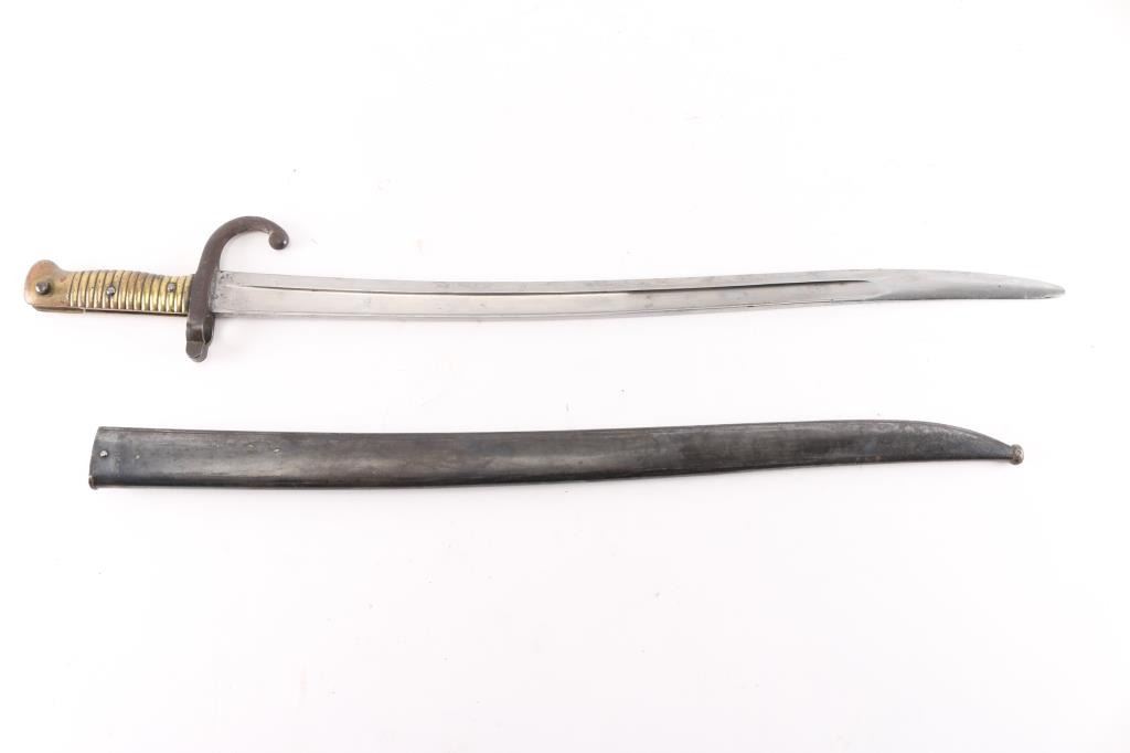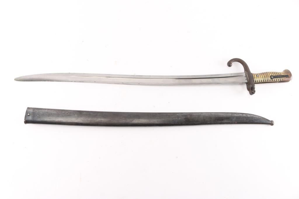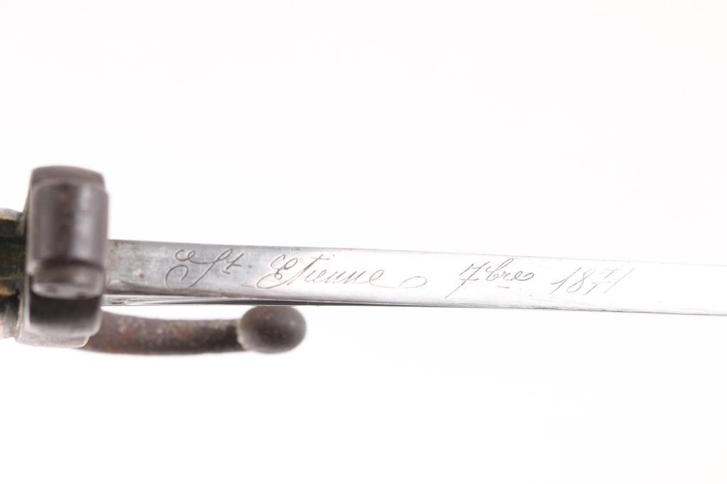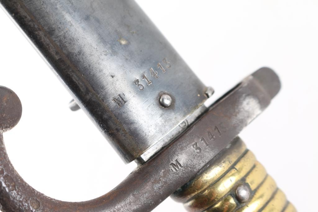 3rd Republic. 22 1/4" Yataghan style blade, wide fuller, the spine of the bayonet is marked St. Étienne 1871, indicating original manufacture at the arsenal in St. Étienne, in 1871. It is in very good condition, with a mostly bright blade, with some areas of light staining. The brass handle has a lovely aged mustard patina. Serial number matched on crossguard and scabbard. French proofs, unit marked in slot "4 H 154". Blade is very good/bright, a couple of very minor nicks to the flat, scabbard is very good.