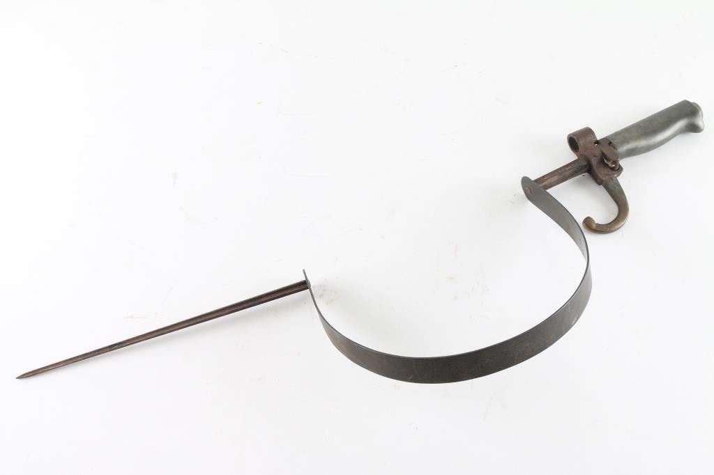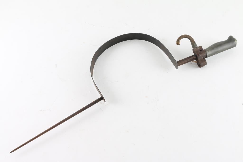 French M1886 Lebel cruciform bayonet that has been cut and affixed to a metal loop to be placed over ones side to give the impression of the bayonet piercing through the body. A interesting piece. From the Joe Musso collection.