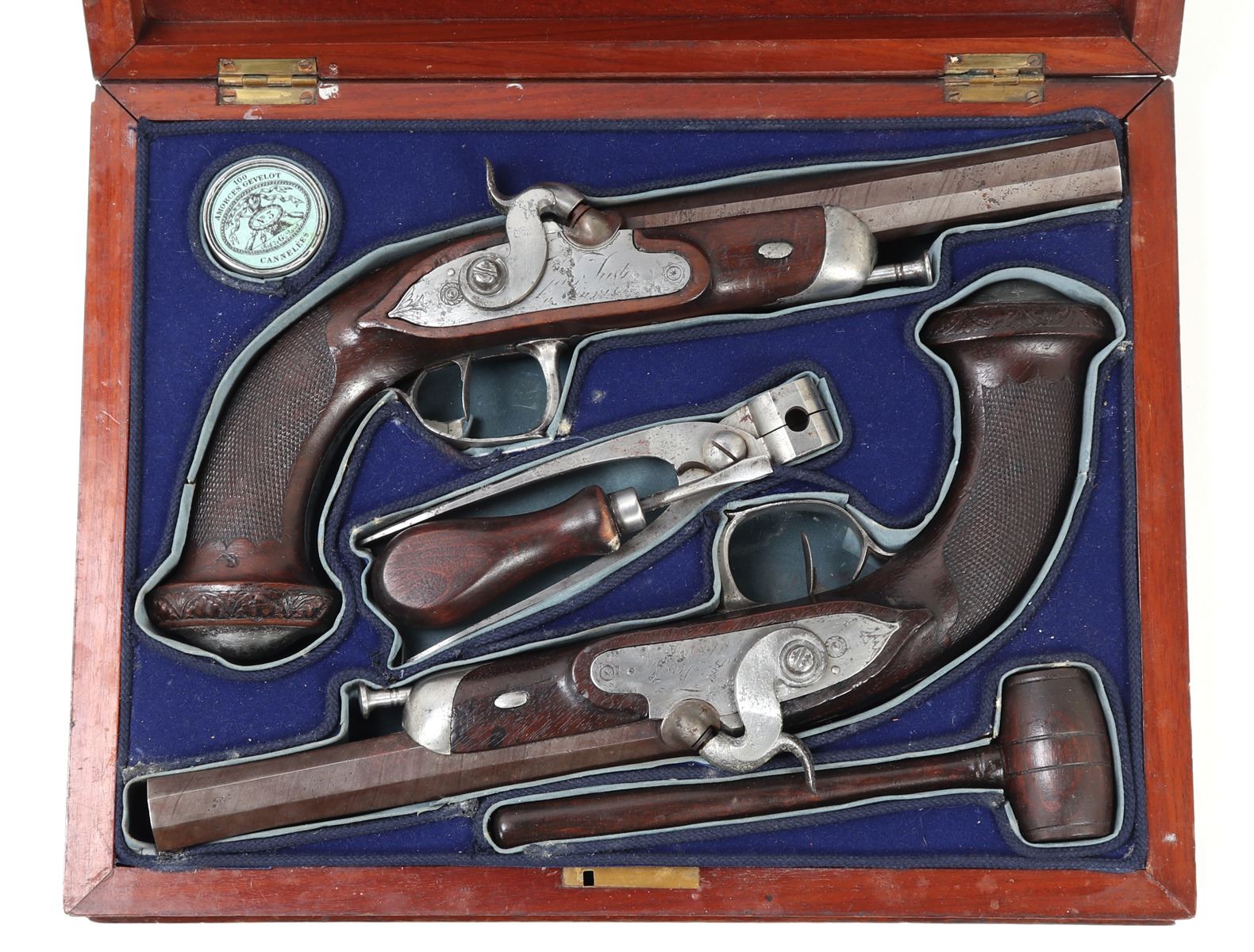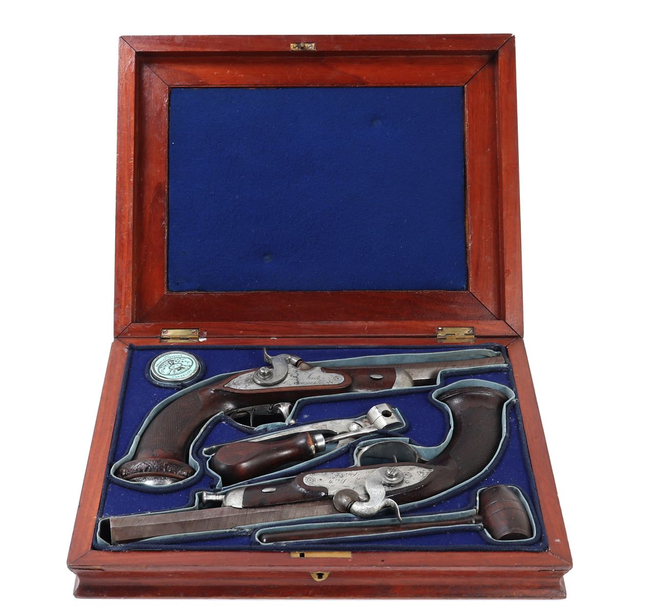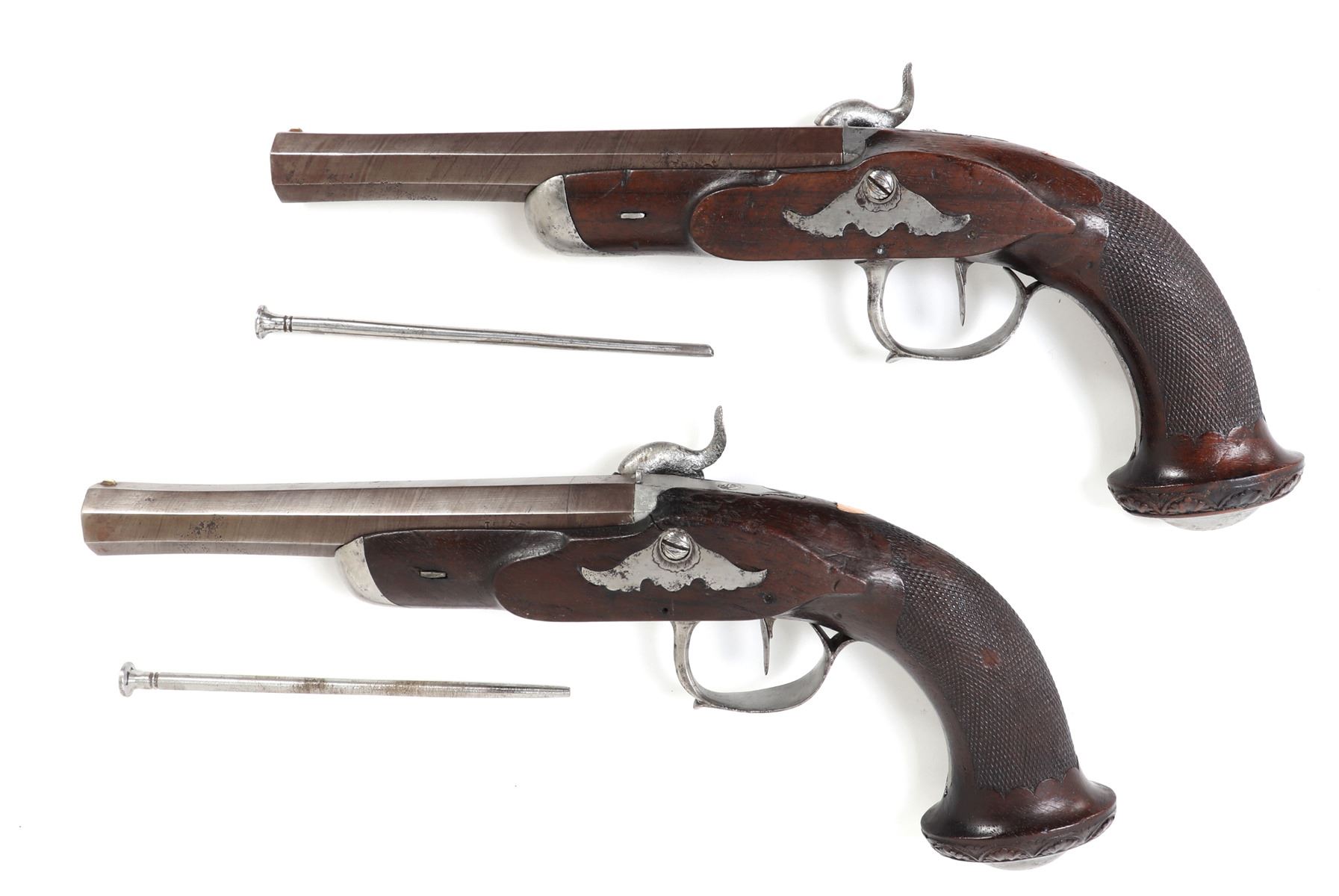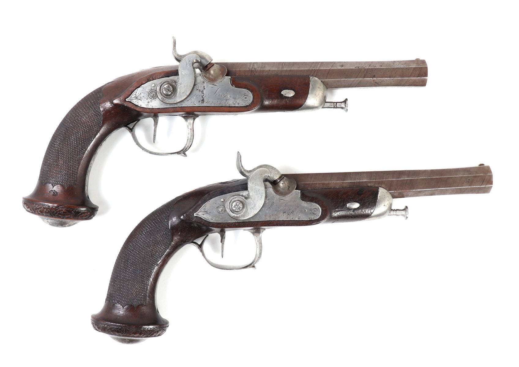 Pair of French officer's percussion pistols with ribbon barrels by Maison Juste in Paris, active between 1835 and 1850. Lock plates with "F par Juste a Paris". Wood stocks in walnut with gold shield thumb piece. Modern case with accessories including bullet mold, mallet, primer boxes and screwdrivers. Size case 13 3/4" L x 10 1/2" W x 2 5/8" H, pistol 12 3/4" L, barrel 8 7/8" L. Condition: Barrels recolored