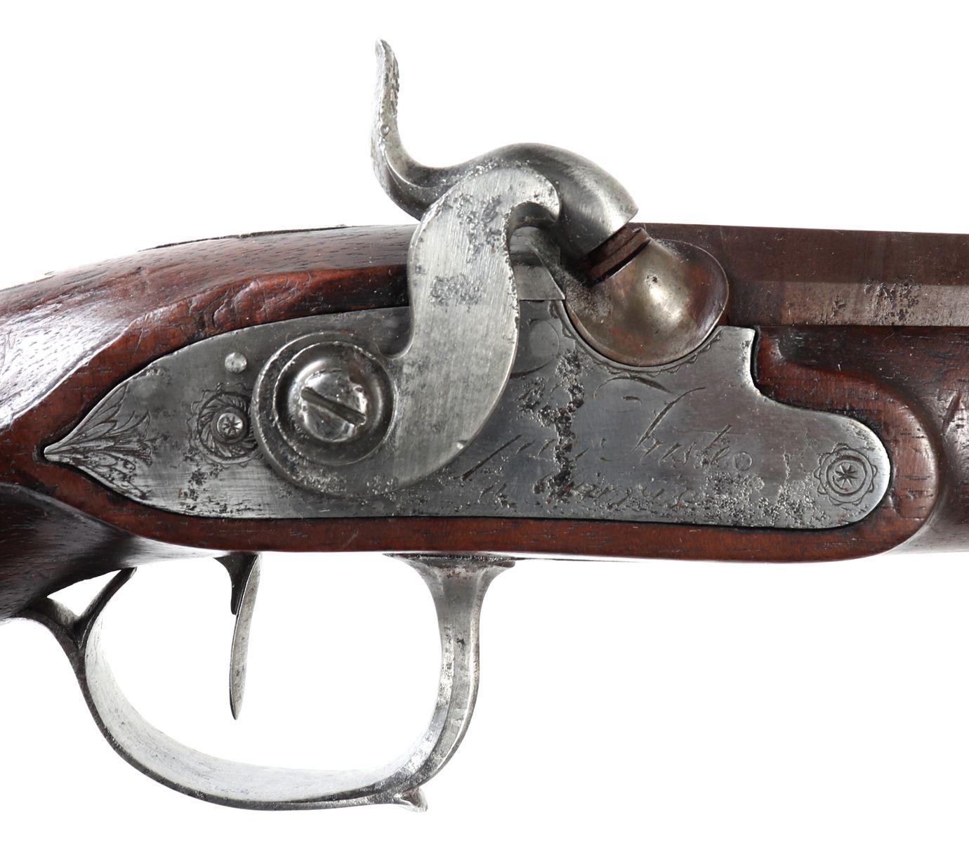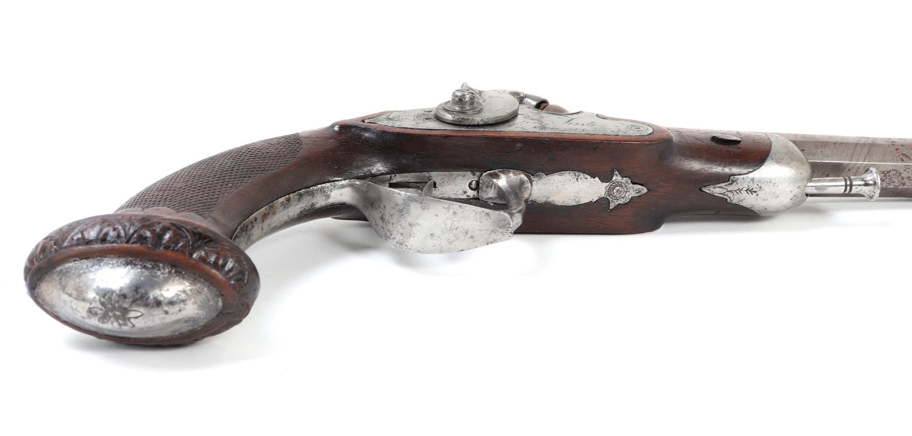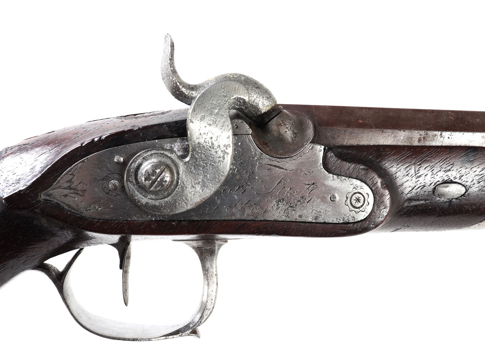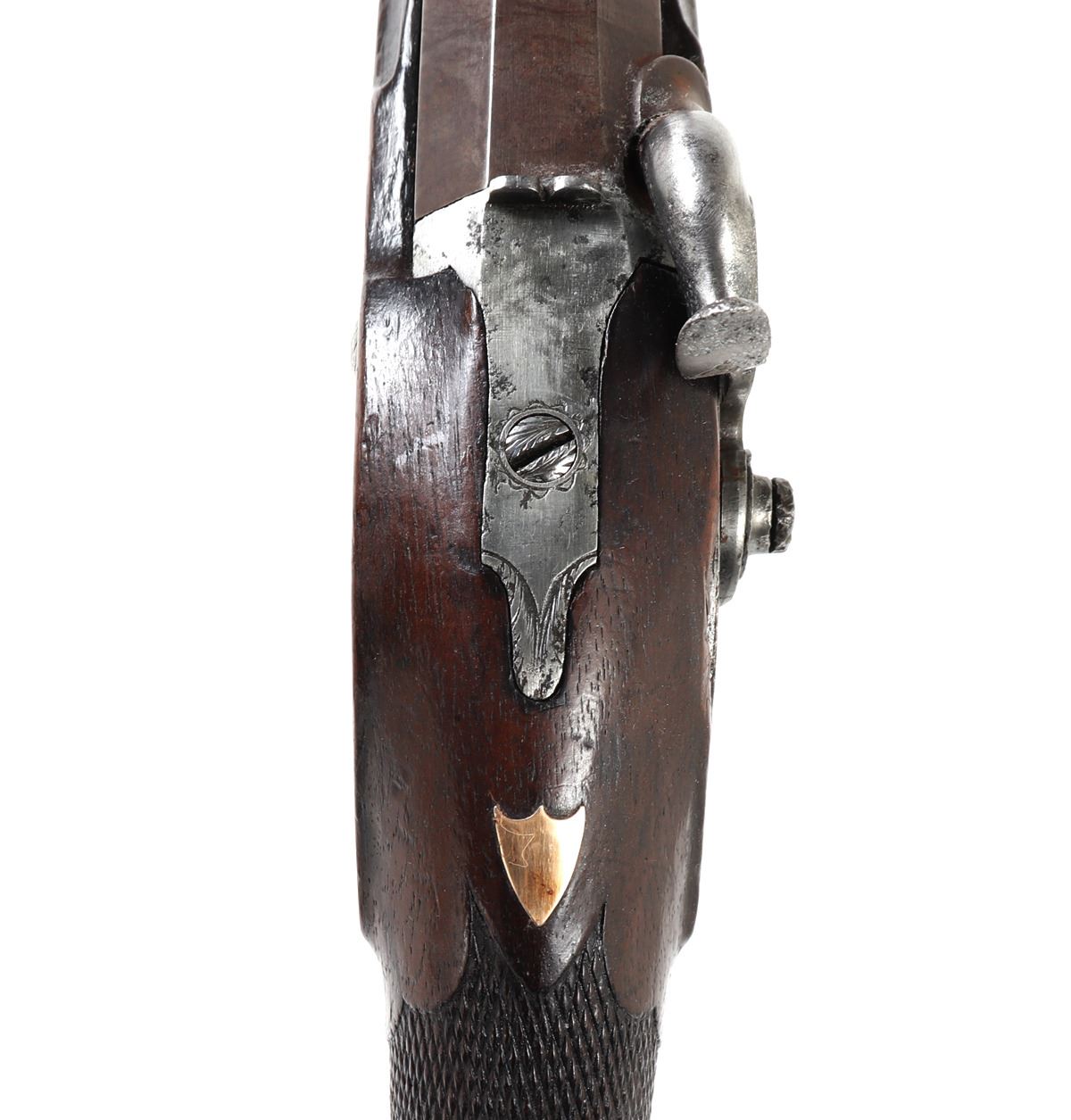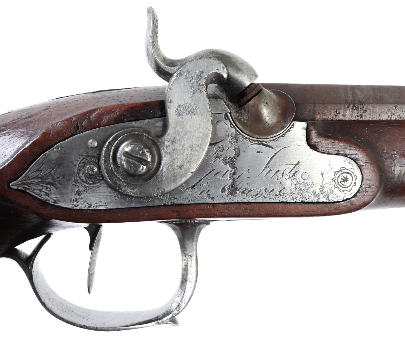 Pair of French officer's percussion pistols with ribbon barrels by Maison Juste in Paris, active between 1835 and 1850. Lock plates with "F par Juste a Paris". Wood stocks in walnut with gold shield thumb piece. Modern case with accessories including bullet mold, mallet, primer boxes and screwdrivers. Size case 13 3/4" L x 10 1/2" W x 2 5/8" H, pistol 12 3/4" L, barrel 8 7/8" L. Condition: Barrels recolored