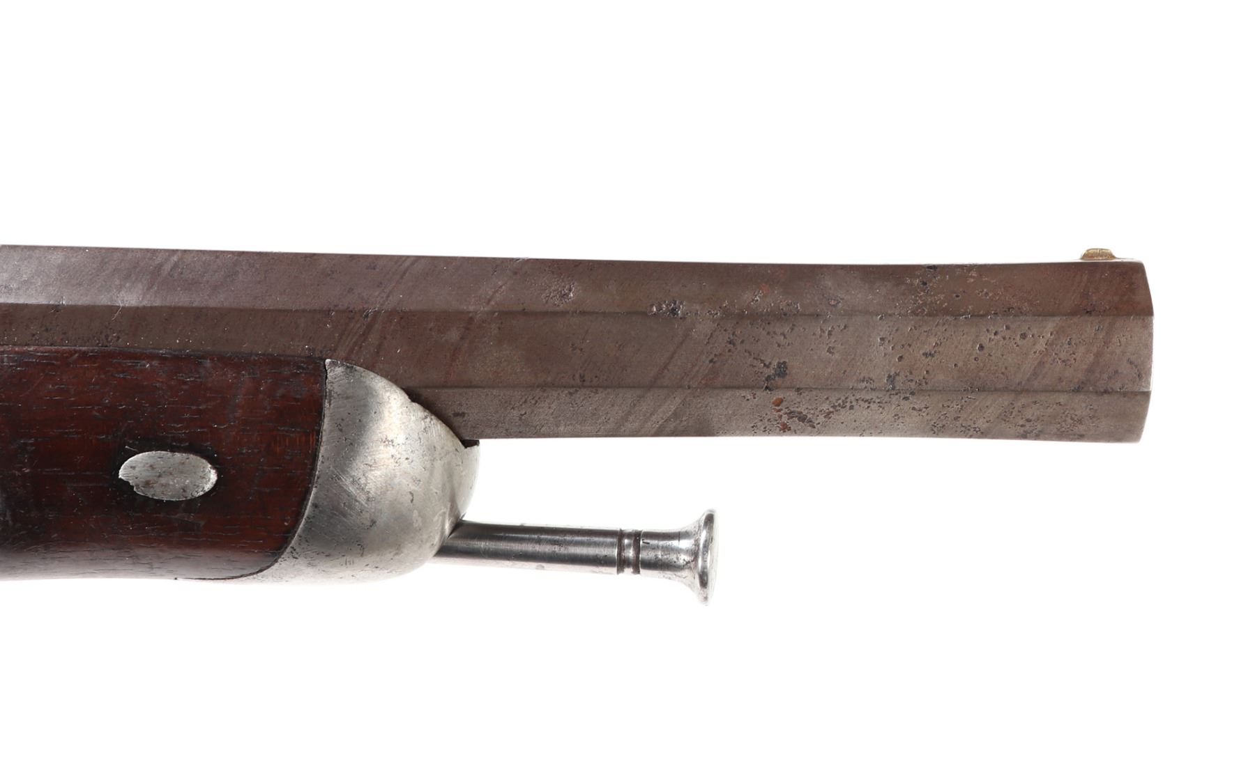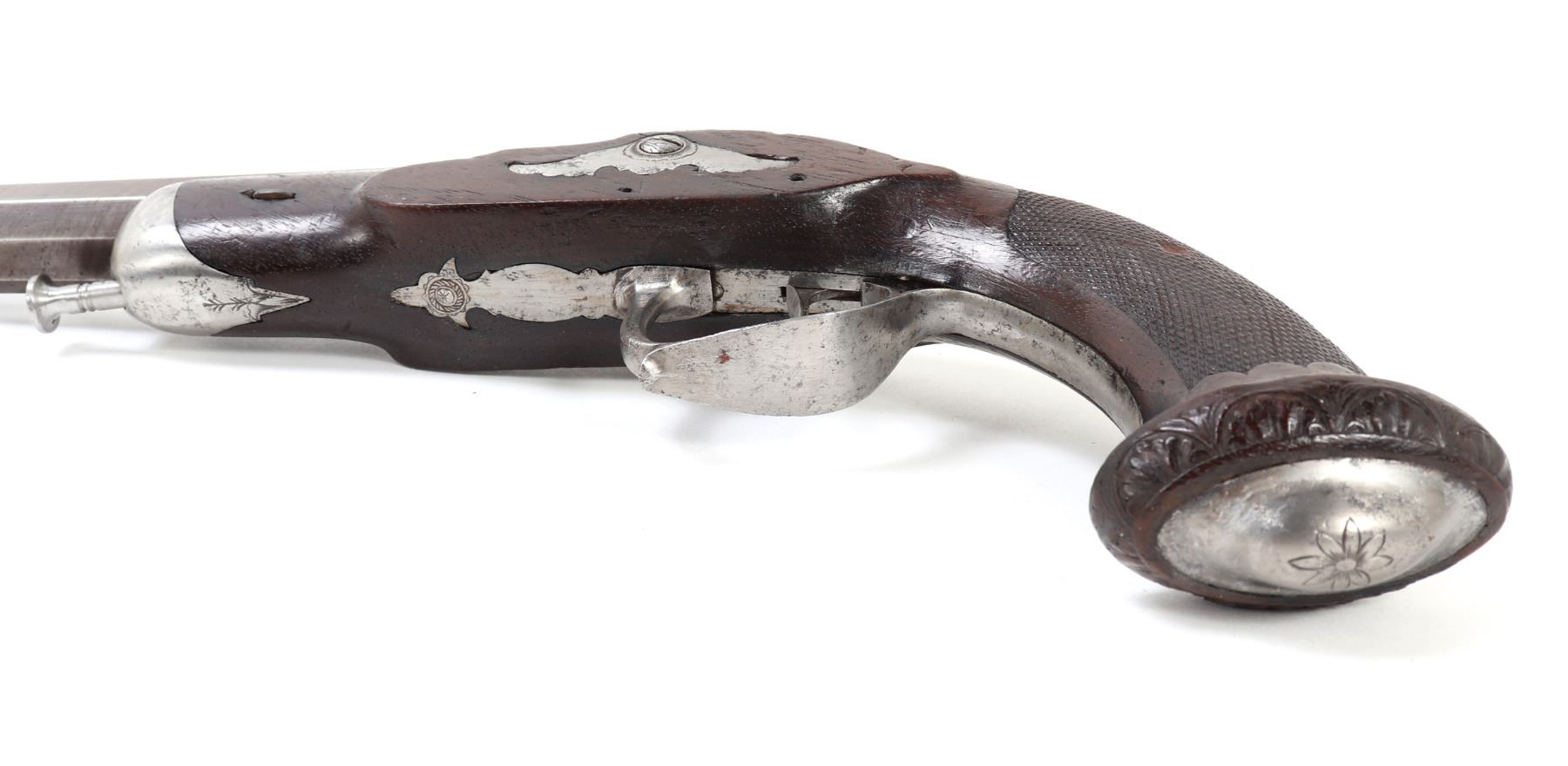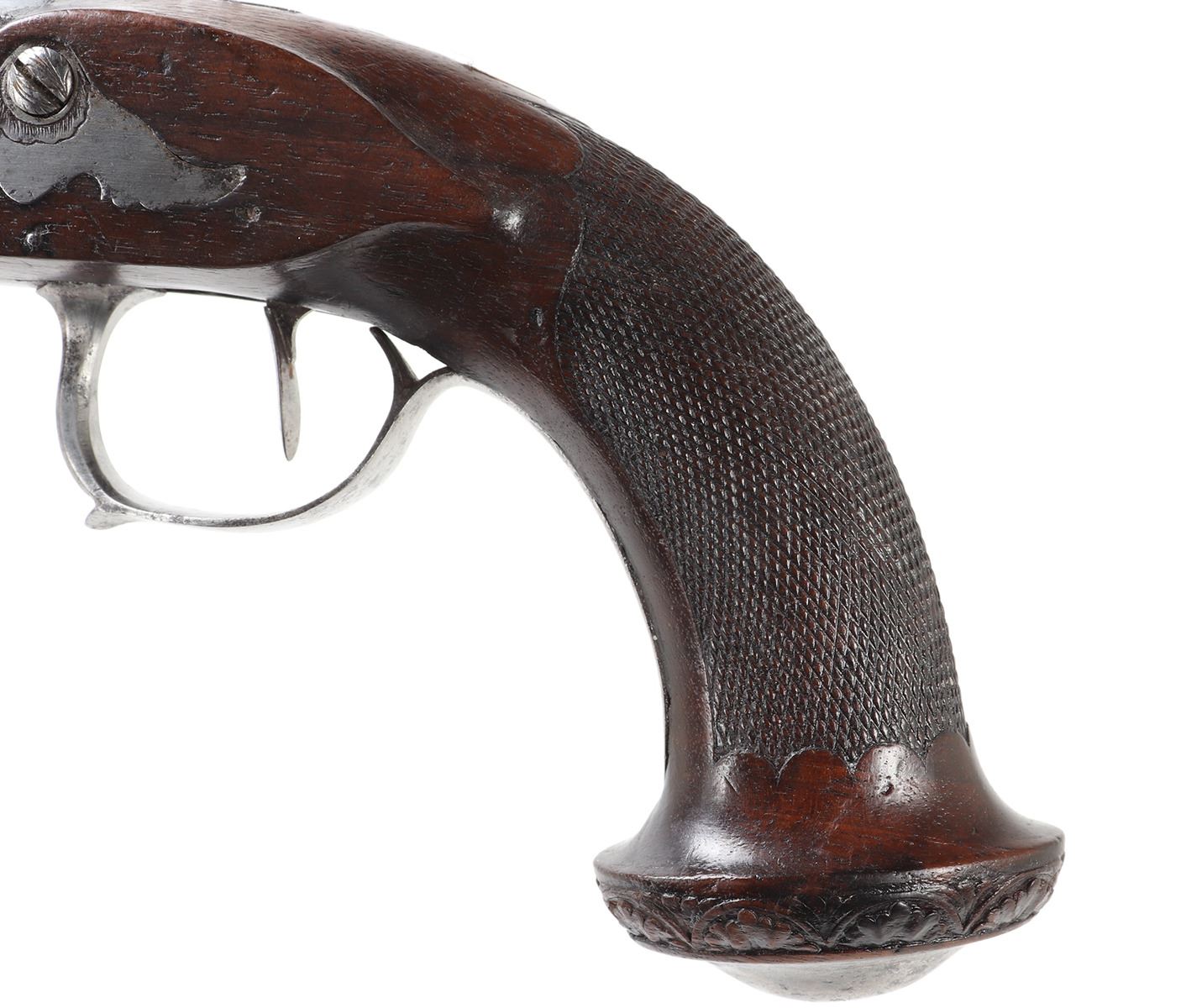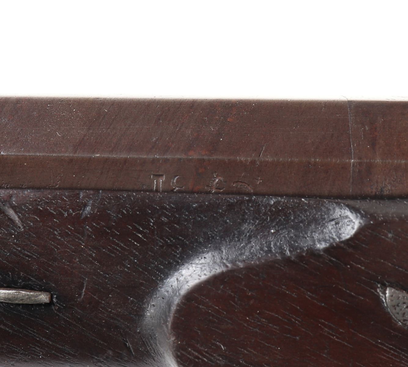 Pair of French officer's percussion pistols with ribbon barrels by Maison Juste in Paris, active between 1835 and 1850. Lock plates with "F par Juste a Paris". Wood stocks in walnut with gold shield thumb piece. Modern case with accessories including bullet mold, mallet, primer boxes and screwdrivers. Size case 13 3/4" L x 10 1/2" W x 2 5/8" H, pistol 12 3/4" L, barrel 8 7/8" L. Condition: Barrels recolored