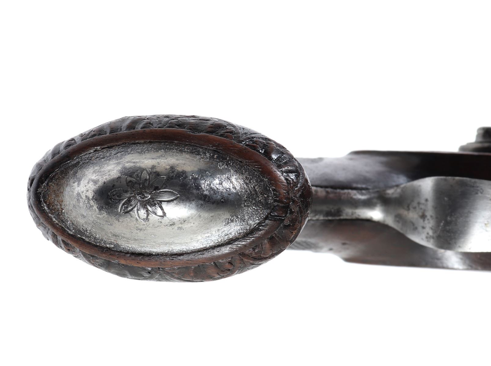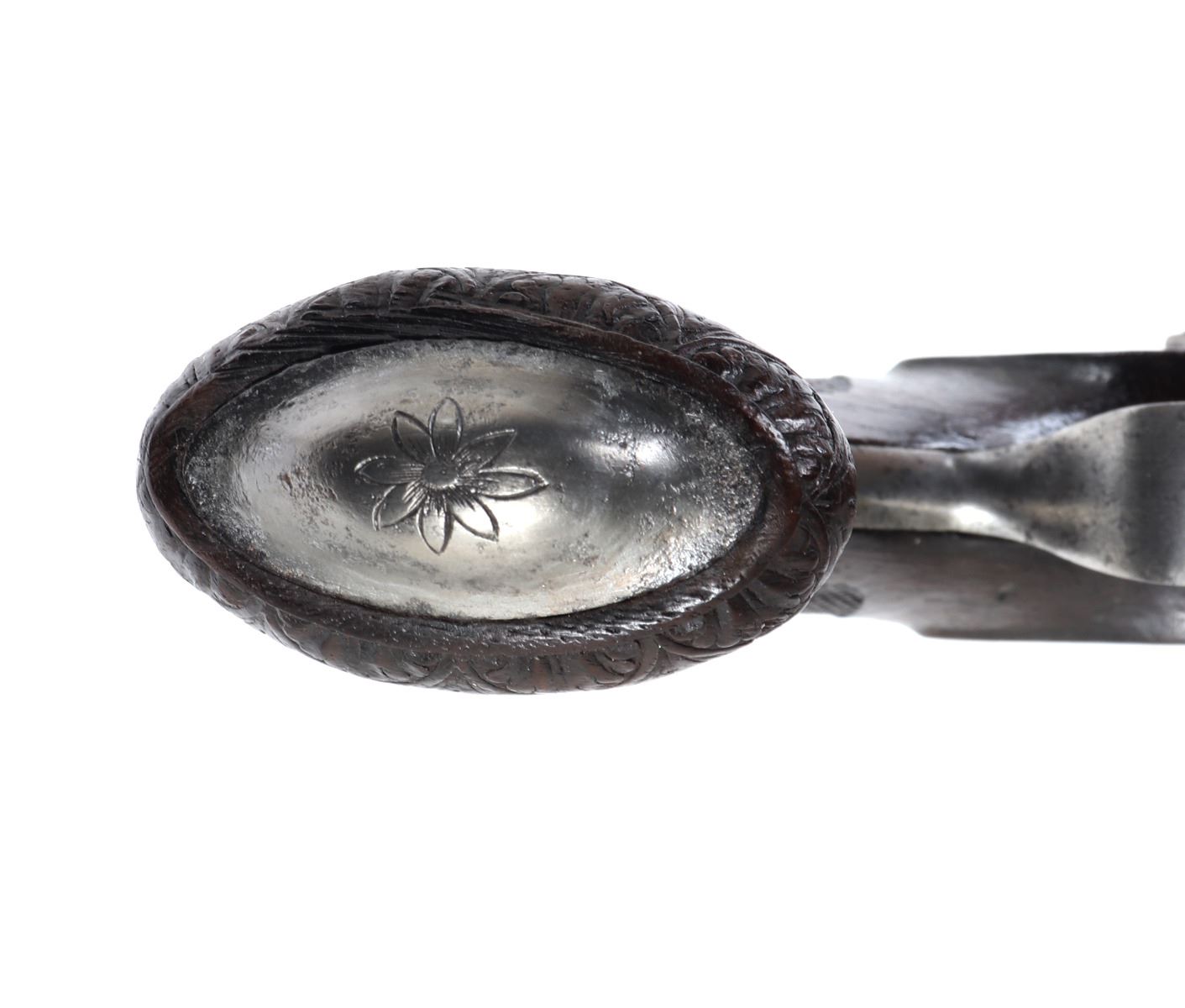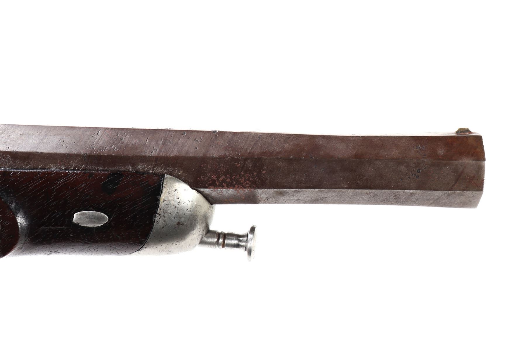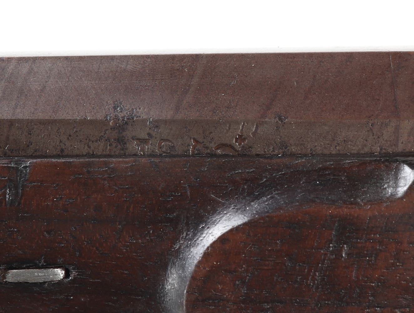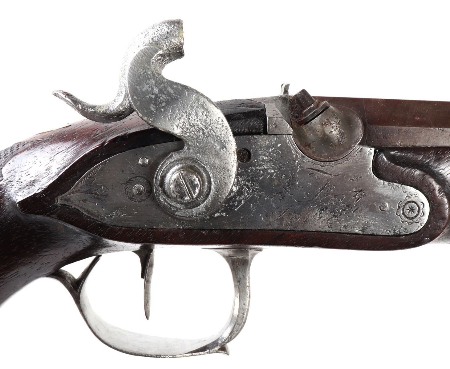 Pair of French officer's percussion pistols with ribbon barrels by Maison Juste in Paris, active between 1835 and 1850. Lock plates with "F par Juste a Paris". Wood stocks in walnut with gold shield thumb piece. Modern case with accessories including bullet mold, mallet, primer boxes and screwdrivers. Size case 13 3/4" L x 10 1/2" W x 2 5/8" H, pistol 12 3/4" L, barrel 8 7/8" L. Condition: Barrels recolored