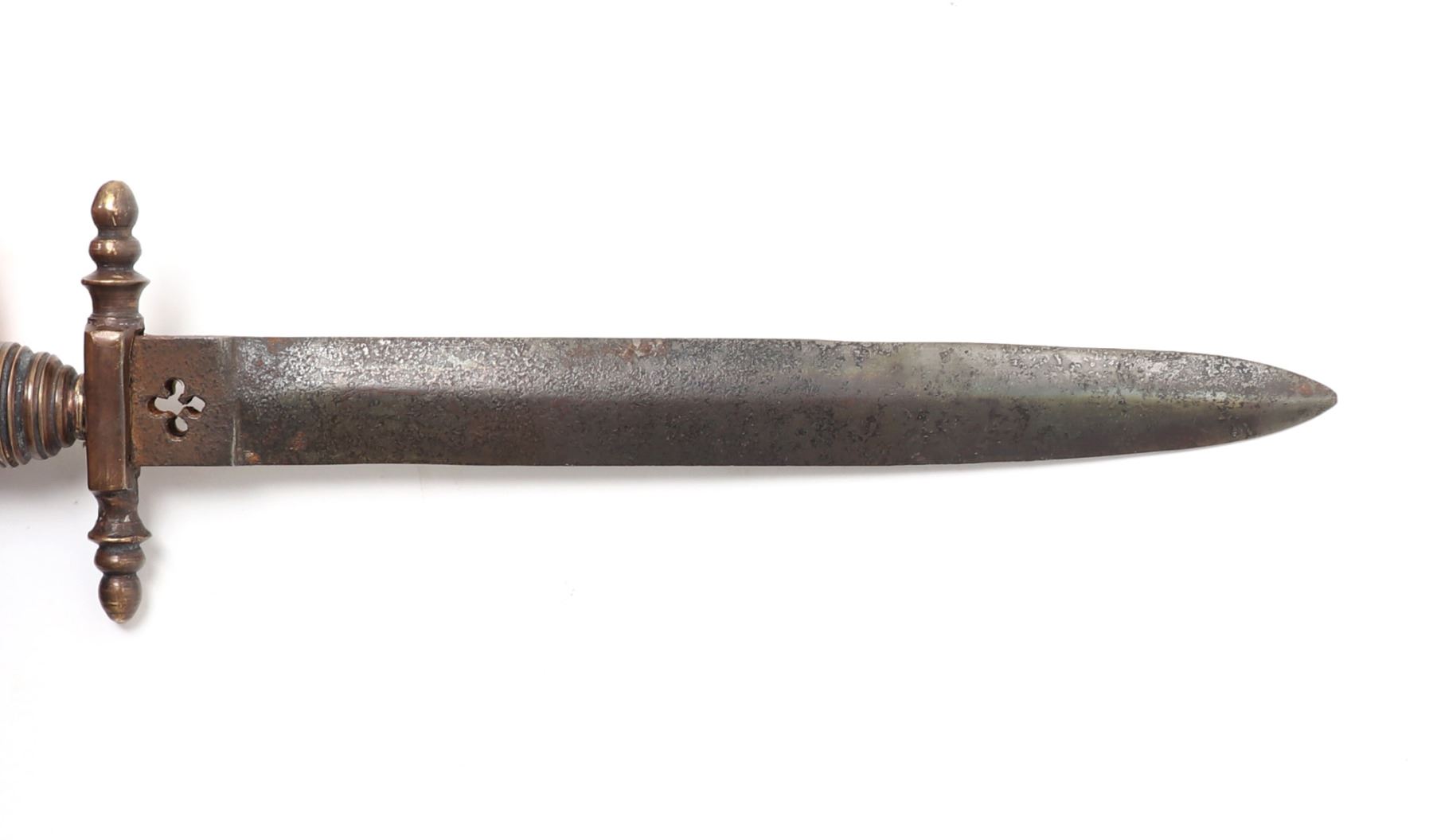 Turned and pierced brass openwork handle French dagger, circa late 1800s. Handle in gilt brass, straight quillion, turned with black wood or bone section between pierced openwork brass. Double edge straight blade with diamond cross-section and pierced to the ricasso with a four point clover. Size 12 1/4" L, blade 6 3/4" L. Condition: light oxidization throughout commensurate with age and use. Provenance: Ex-Arizona Collection