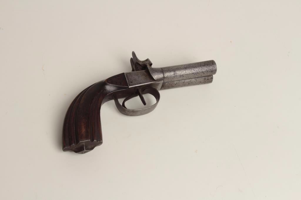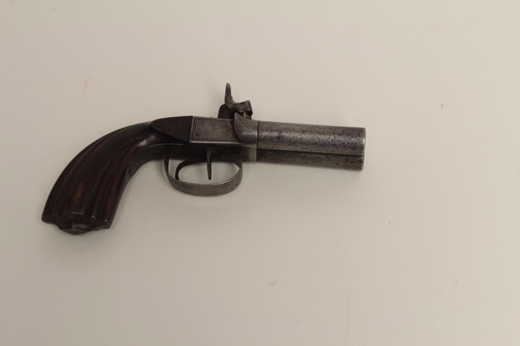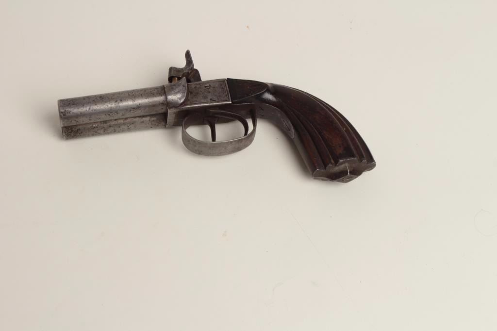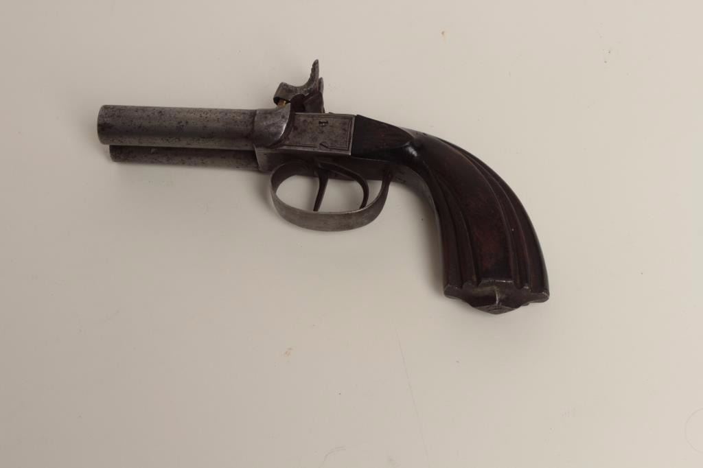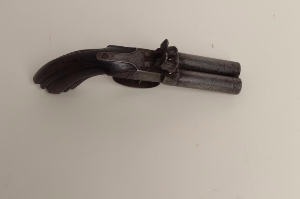 pocket pistol with classic fluted grip in .44 caliber with 2 ¾” SxS barrels and nearly 7 ¾” overall. Some minor pitting but good to very good overall. No name or visible proofs. Works well. Nipples are an old replacement. (Antique) Est.: $200-$400