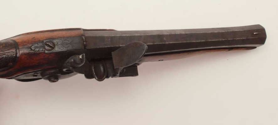 French style Napoleonic era Officers flintlock pistol by Bury of Liege, Belgium, ca. 1805-1815, in as found condition, missing top jaw of hammer; stock broken at forend; restorable. (Antique). Est.:$200-400