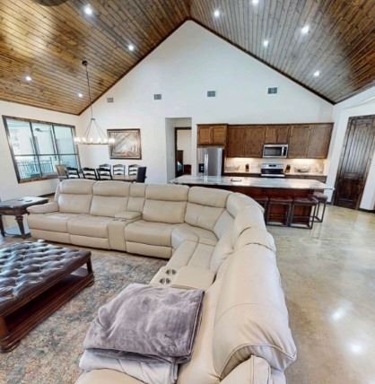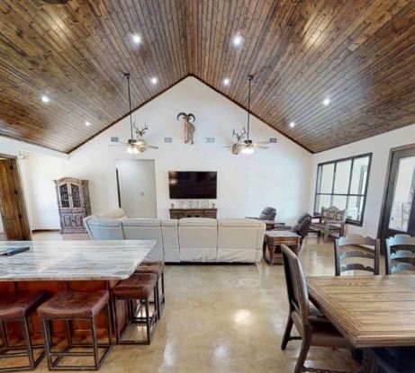 At 3600 sq ft.with 5 bedrooms and 5 1/2 bathrooms, this gorgeous property is spacious enough for 26 guests to enjoy an unforgettable Frio River vacation for 4 days, 3 nights. Featuring a fully furnished kitchen with two indoor refrigerators plus a third one outside, Wi-Fi, and televisions and private bathrooms in every bedroom, this property has all the comforts of home and more! Outside, guest will enjoy the beautiful private pool and hot tub, stargazing around the fire pit, and visiting in the outdoor entertainment area with bar seating and an outdoor TV. Kids and kids at heart will stay busy climbing on the playscape outside and having dart, ping-pong and cornhole tournaments in the game-room style garage.