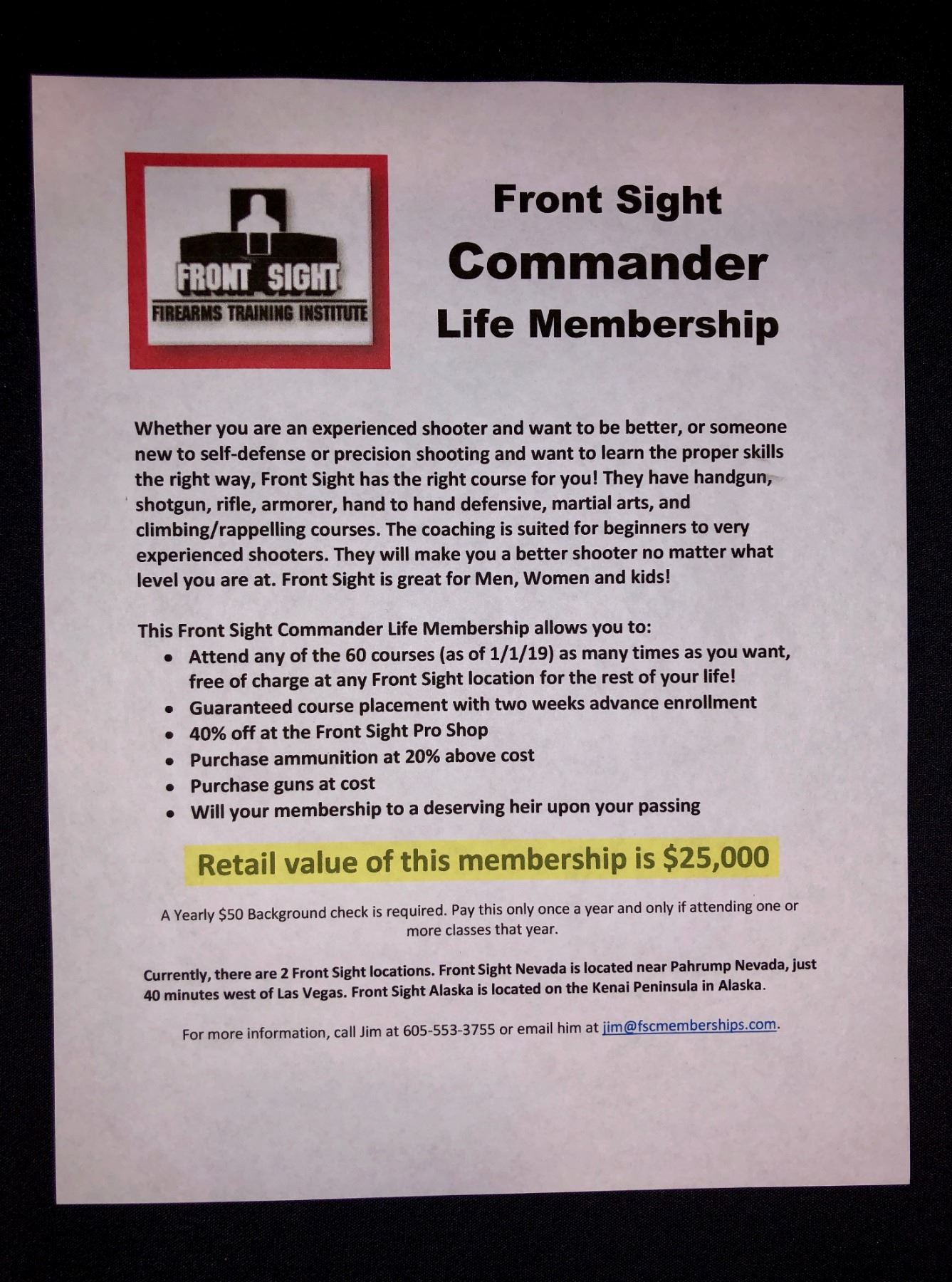 Lifetime Commander Membership in Front Sight Firearms Training Institute. Normal price for this Lifetime Membership is $25,000 and each person purchasing this Lifetime Membership also receives two free 4-day gun rentals (a $400 value) and one free course certificate for a non-Front Sight Member (up to a $2,000 value). This Front Sight Commander Life Membership allows you to: