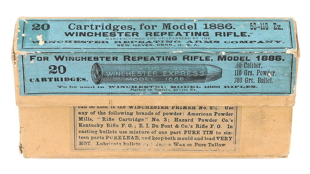 This is a two-piece box of 20 Winchester 50-110 Express Cartridges for the Model 1886 with 300 gr. bullets. The box remains in very good to excellent condition overall showing some minor flaking of the blue label that remains 99% complete, along with lightly worn corners and edges. A scarce and desirable box of ammunition for the Winchester collector. (2A11418-1-74) (800/1200)