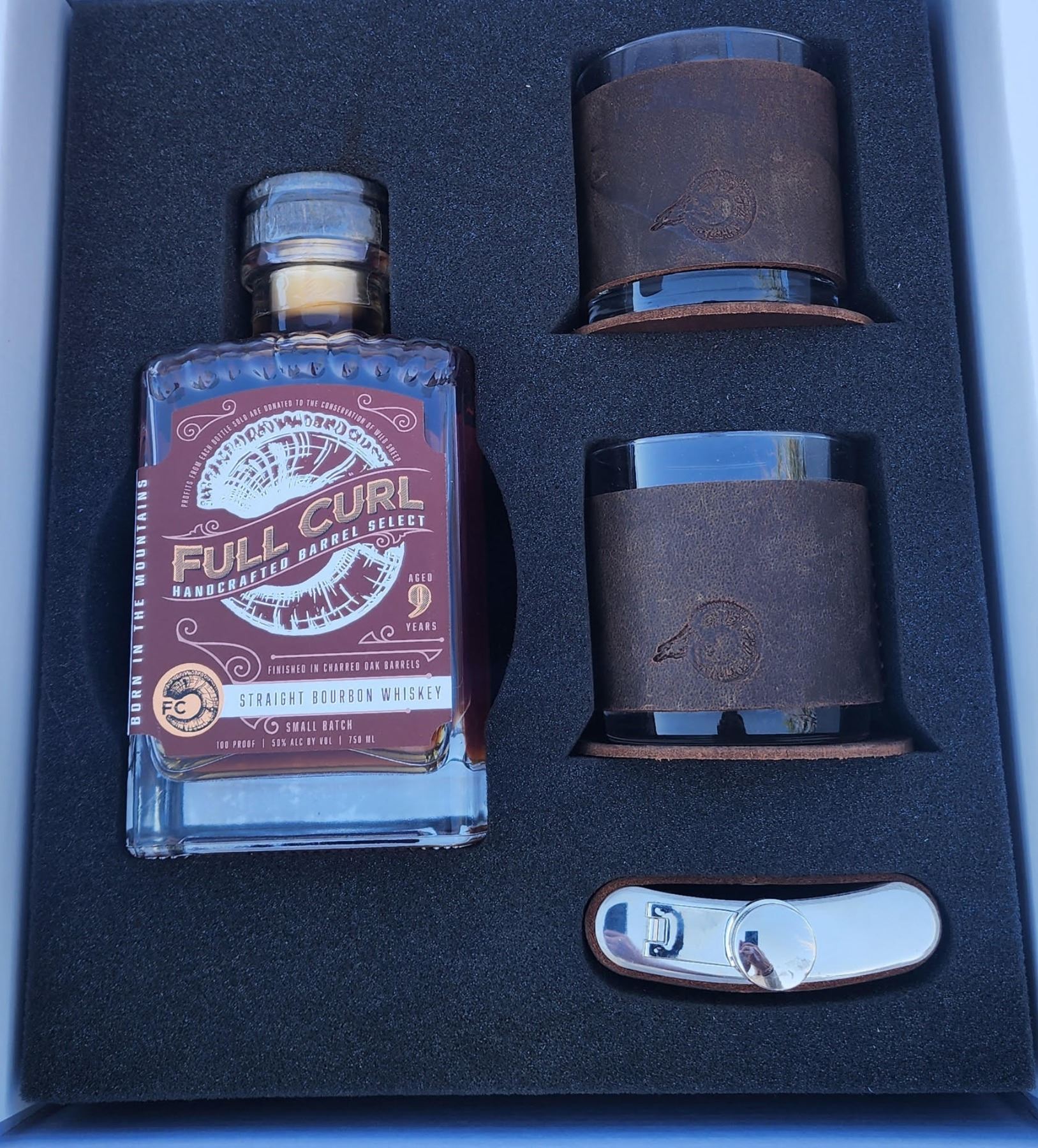 Full Curl 9 Year Bourbon Wiskey w/ 2 Leather Wrapped Glasses/Coaster & Leather Wrapped Flask