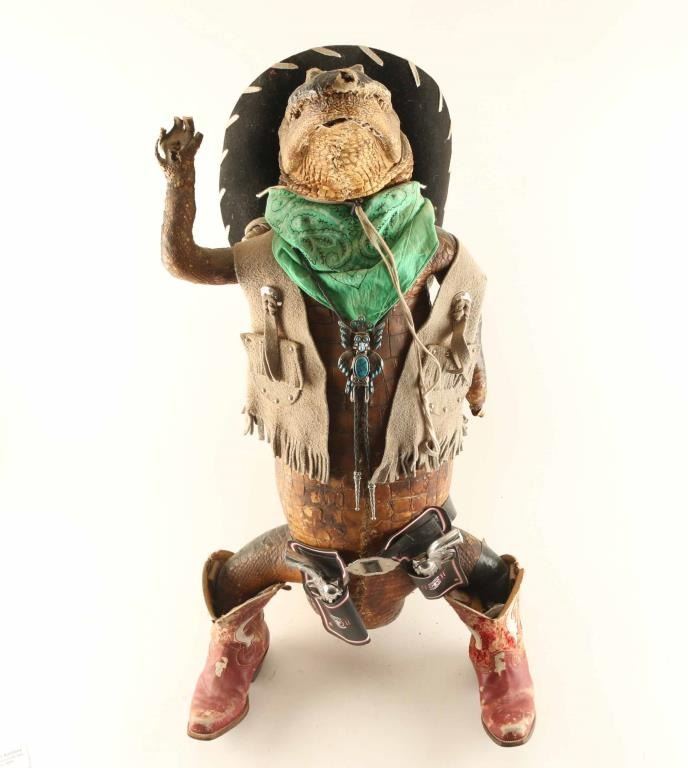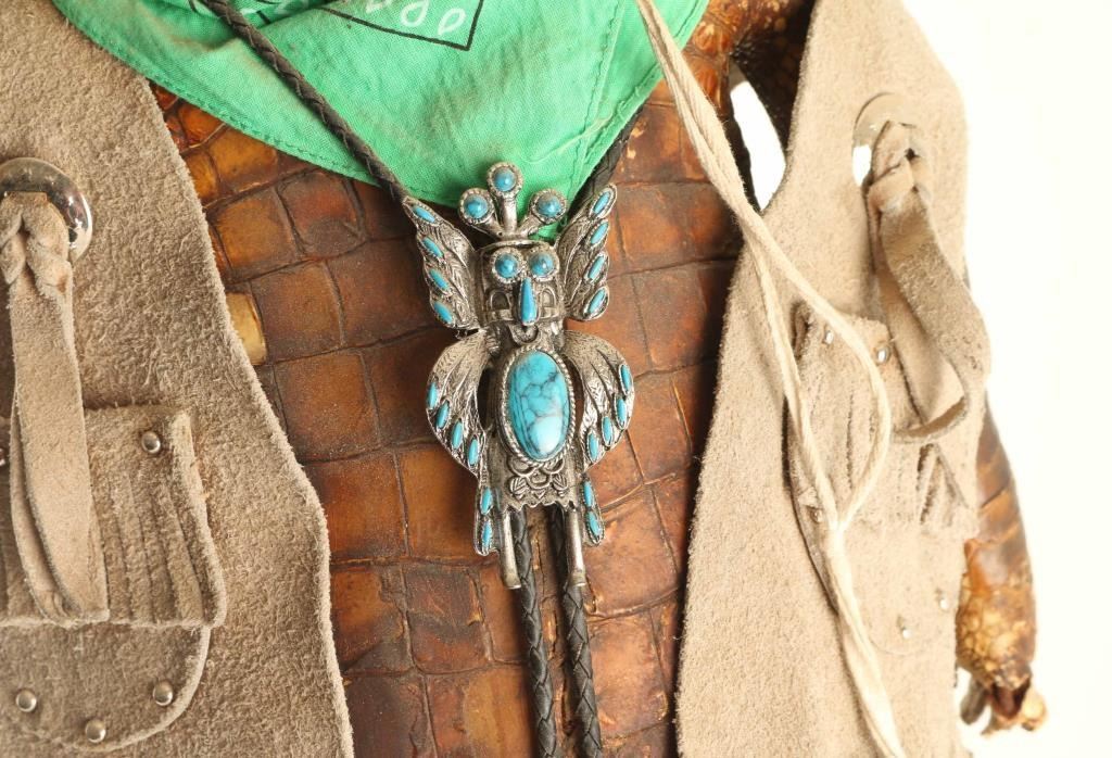 dressed like a cowboy wearing including boots, rig, and hat, in a standing position. Measures 20" tall, x 17". Shows age and scattered losses. From the collection of Arizona collector Don Fortney.