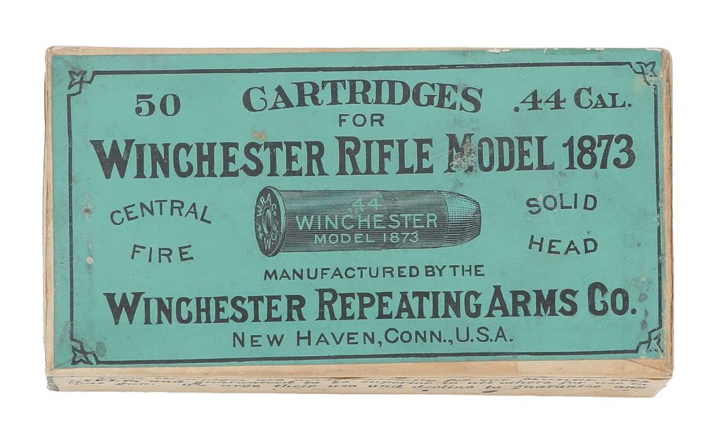 This lot includes a 50-round two-piece box that shows an area of seam separation on the bottom left edge of the box. The box has crisp corners and edges. The green top-label is 98% complete, remaining in excellent condition along with the side labels. (2A11418-1-6) (700/900)