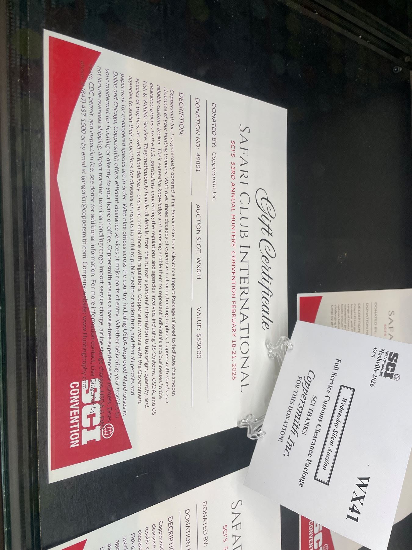Coppersmith Inc. has generously donated a Full-Service Customs Clearance Import Package tailored to facilitate the smooth clearance of your hunting trophies.