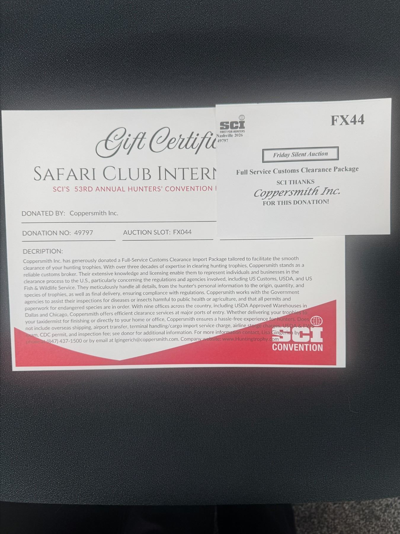 Coppersmith Inc. has generously donated a Full-Service Customs Clearance Import Package tailored to facilitate the smooth clearance of your hunting trophies.