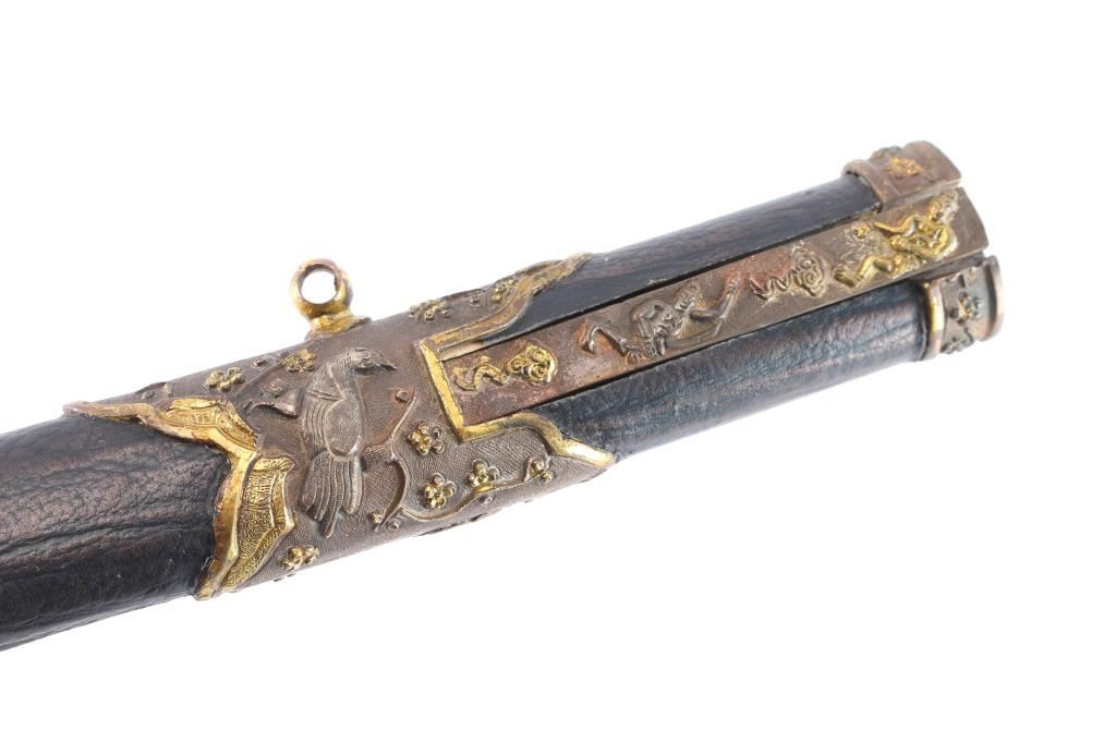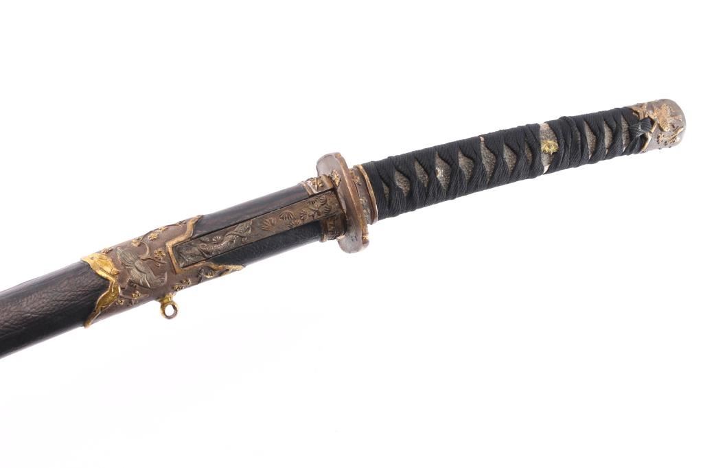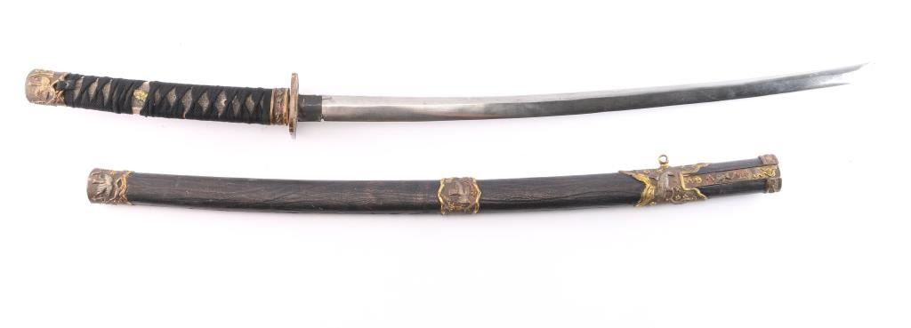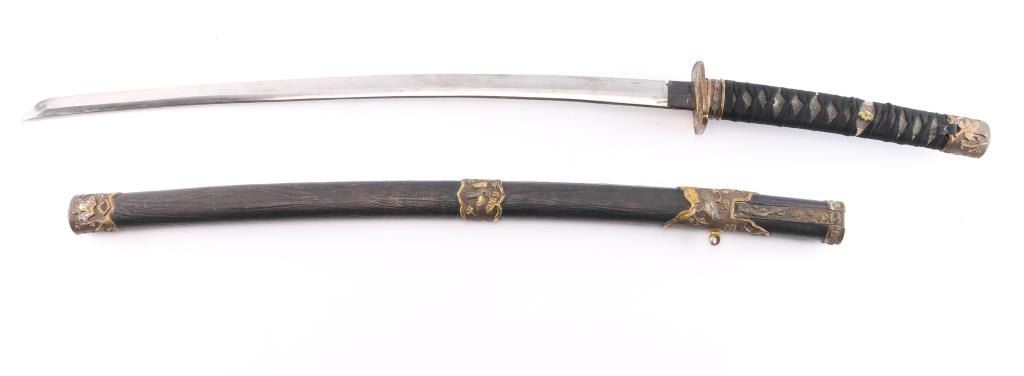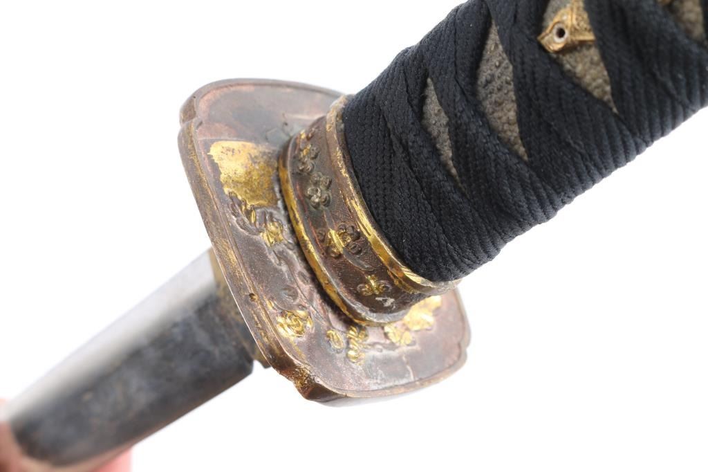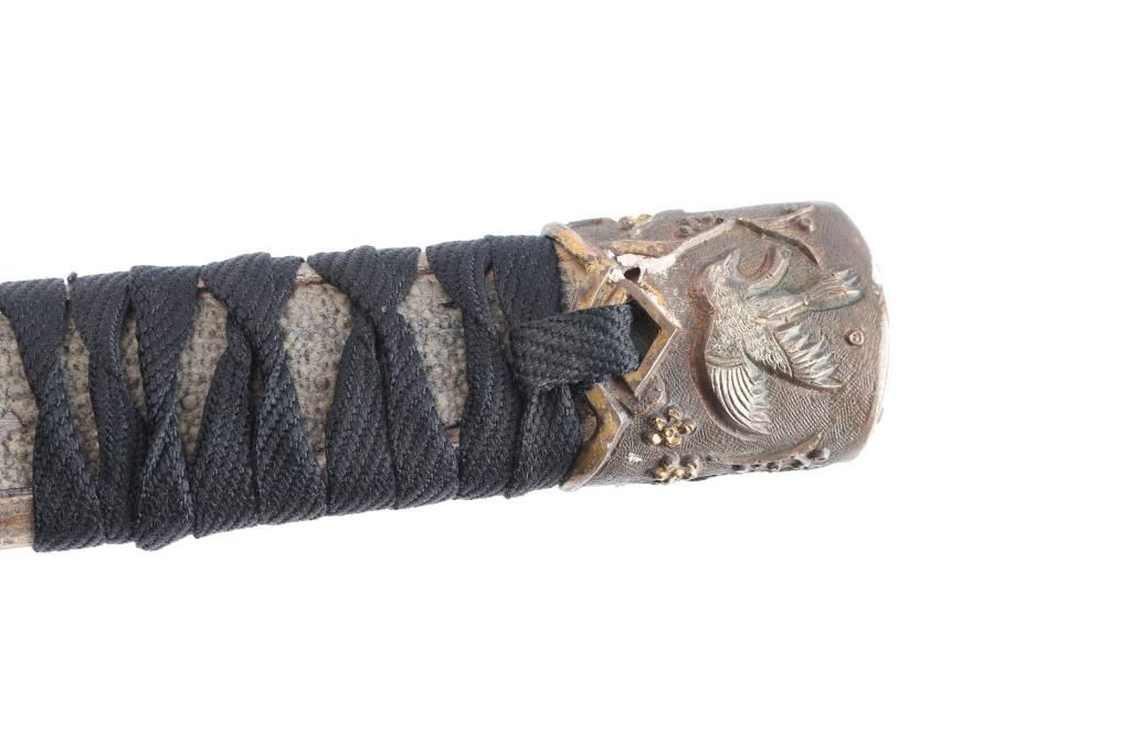 Appears to be a old copy of a Japanese Full tang Katana Sword, possibly Chinese. Shows age and wear. 28" 'Damascus' Steel blade, the brass blade collar (Habaki) is stamped "77734" , the tang has a 4 Mei signature. The ray skin grip is wrapped in black cloth with Menuki. The pommel and scabbards fittings have small bird motifs, the wood scabbard is wrapped in sanded ray skin, the Fuchi and Tsuba have floral motifs and the scabbard contains a set of a kogai (hairpin/ear scoop) and a kogatana. (small utility knife). Both were carried in the scabbard. Together, such a matched pair is called Futakoromono. The scabbard is missing the ring, and the bamboo grip pin is missing, the left side of the blade has a small patch of pitting. An interesting sword. Worthy of further research.